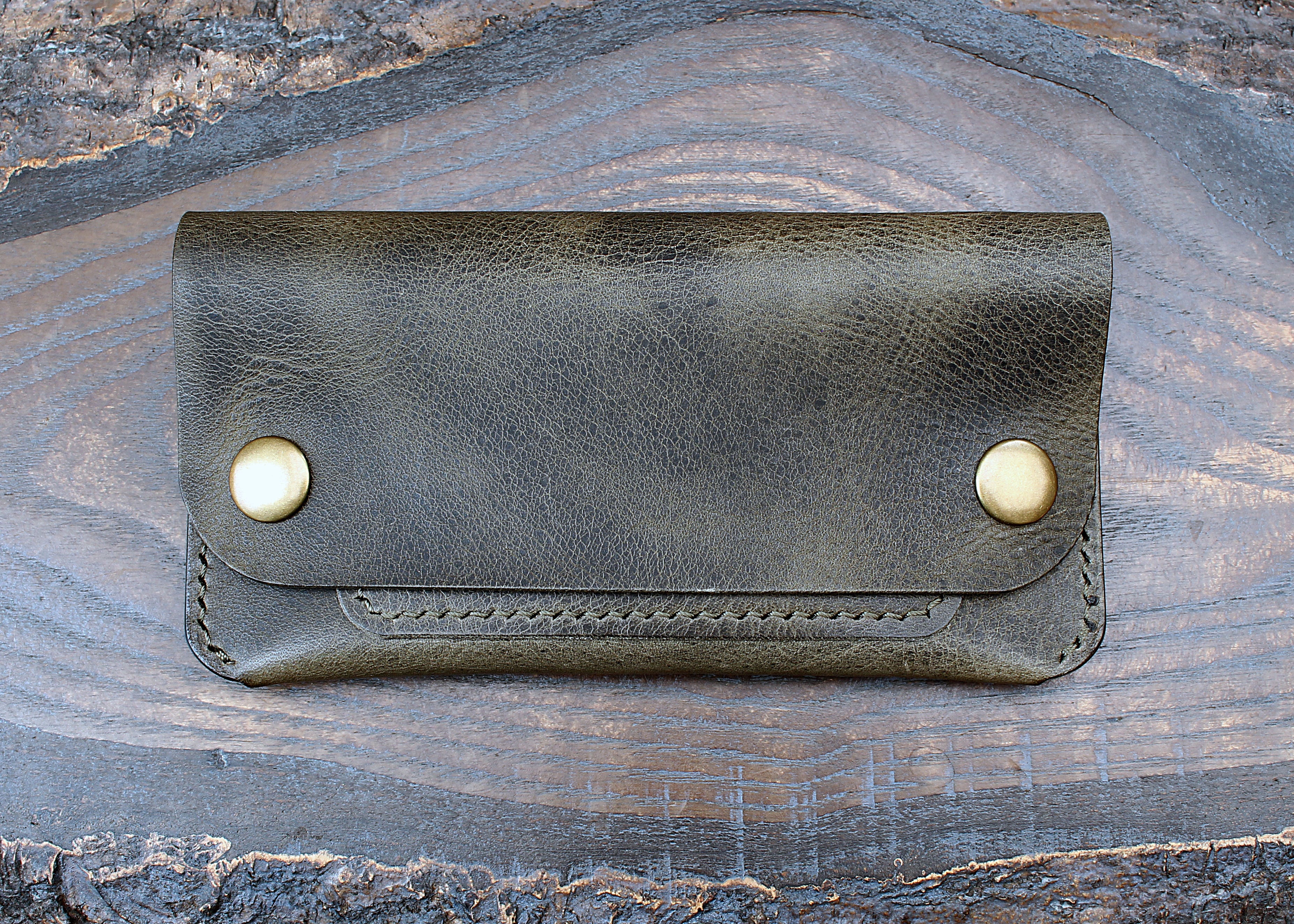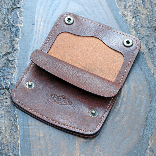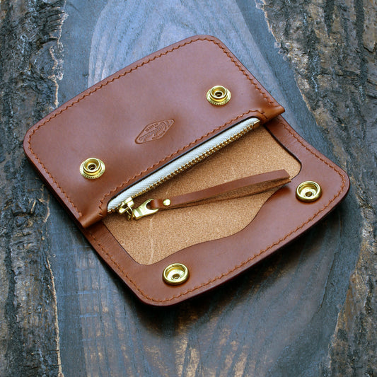Trucker-style wallets with zip compartments and practical leather pouches with brass snaps. Great for cash, cards and hey, even for you old-school coin carriers. Every piece is cut, saddle-stitched and finished by hand.