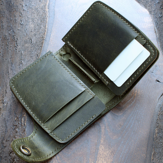 Japanese-style short bifold, olive Wax, vintage coin snap