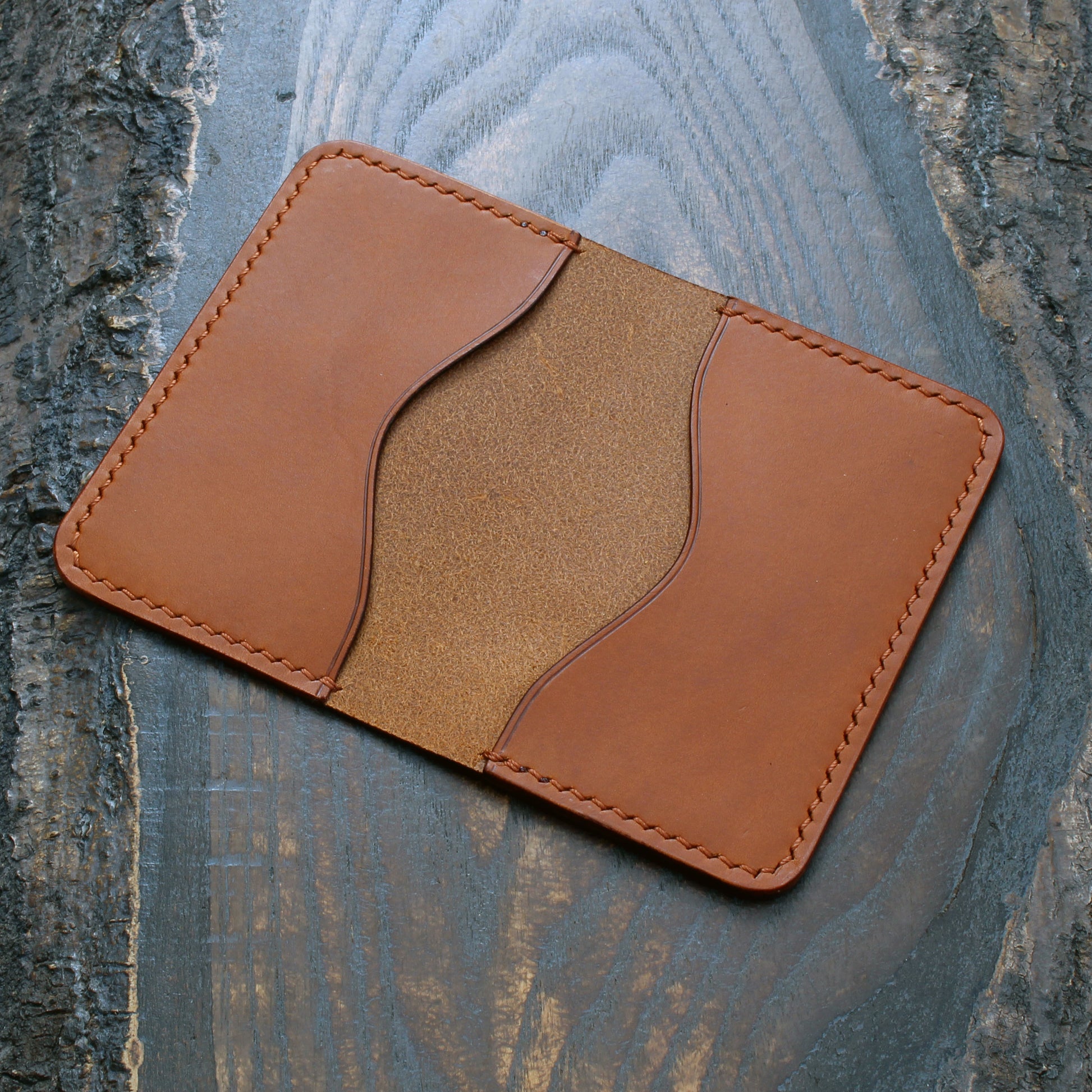 A unique, compact bi-fold card wallet made using tan Minerva Liscio leather from Badalassi Carlo in Tuscany. This soft, very smooth leather has natural feel and will develop a lovely patina over time. I've used 2 weights of leather to reduce bulk, and it's all saddle-stitched together by hand using auburn Vinymo thread from Japan.