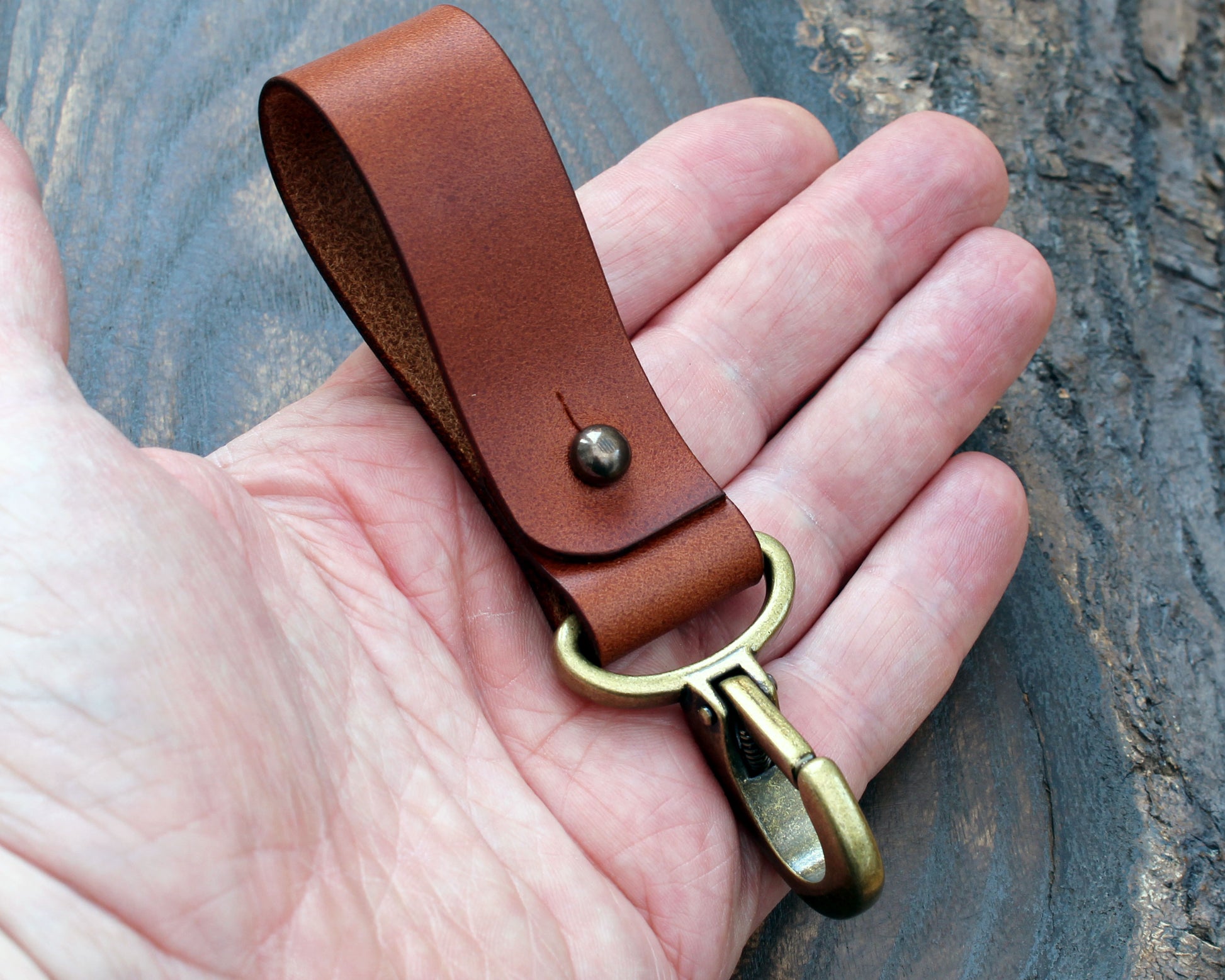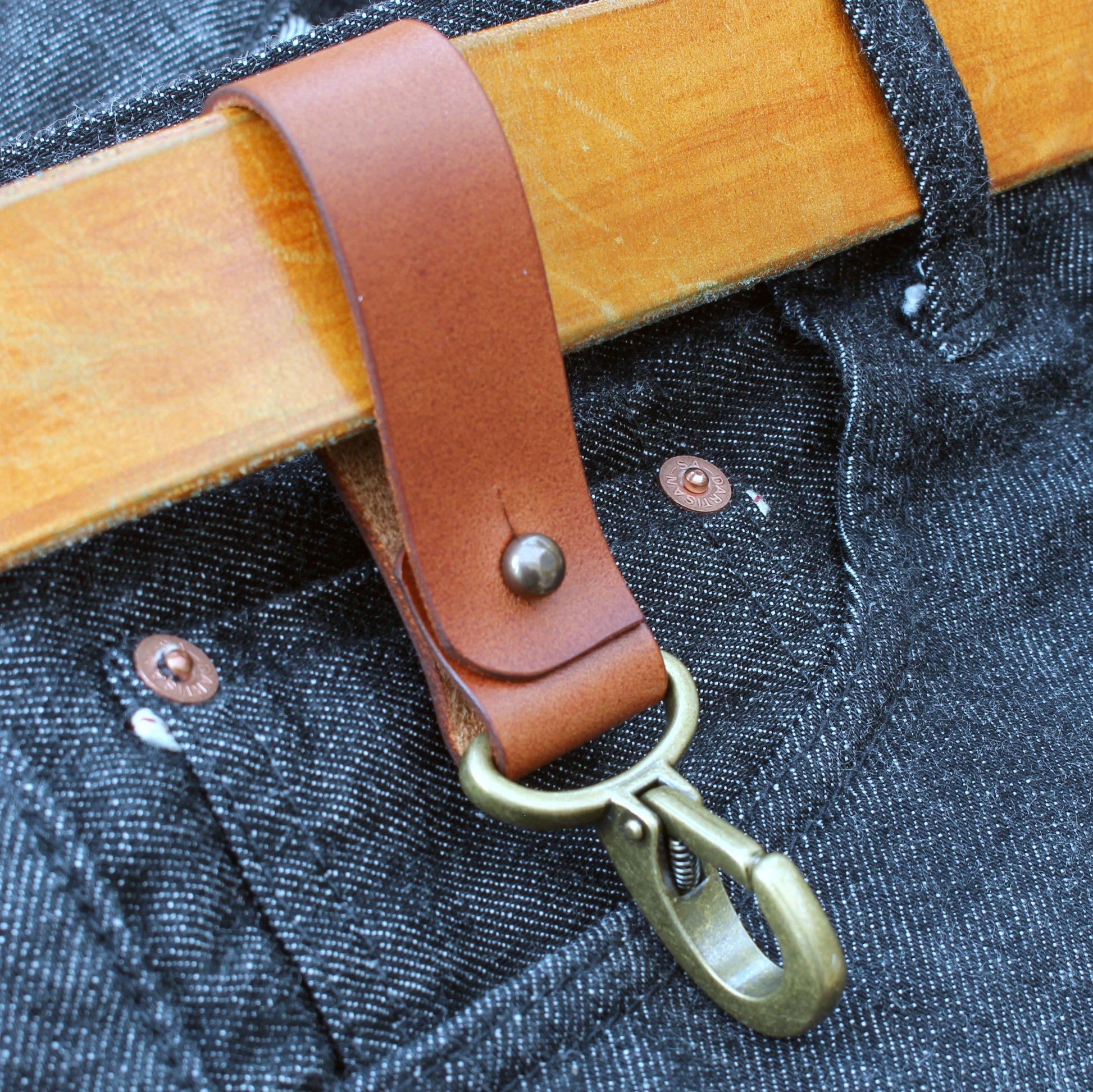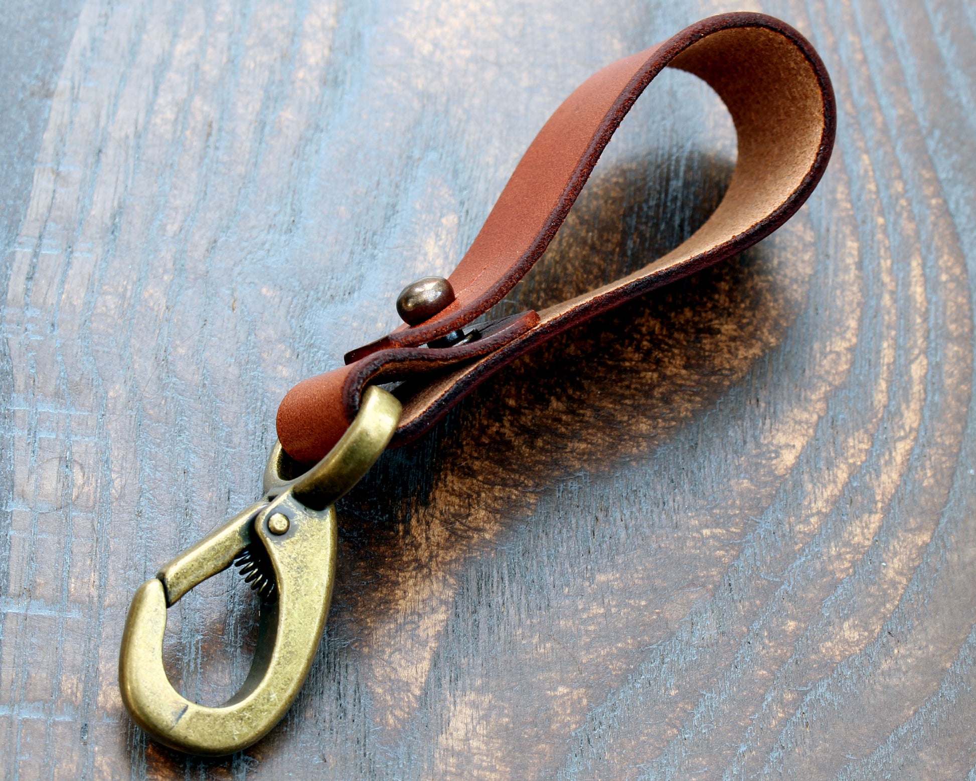 Simply loop over a belt for a perfect, easy-access key holder or just use as a secure handle for a bunch of keys. The clip is non swivel so you'll always know which way the clip opening is facing. The leather fastens onto a 'Sam Browne' stud, it can be a little stiff at first but the leather will quickly soften up.