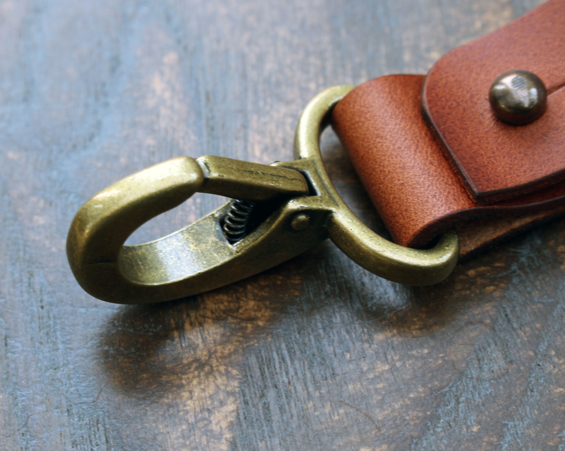 These hip-clip key holders are the perfect way to attach keys securely to a belt. They use solid brass clips imported from the USA - much higher quality than other Chinese versions I've seen - they're really sturdy with a nice equestrian feel. The Buttero leather strap is cognac in colour, around 25mm wide / 2mm thick with a Buck&Hide logo debossed to rear.