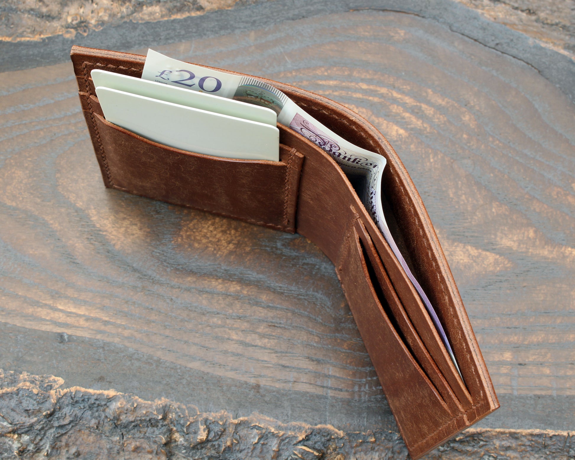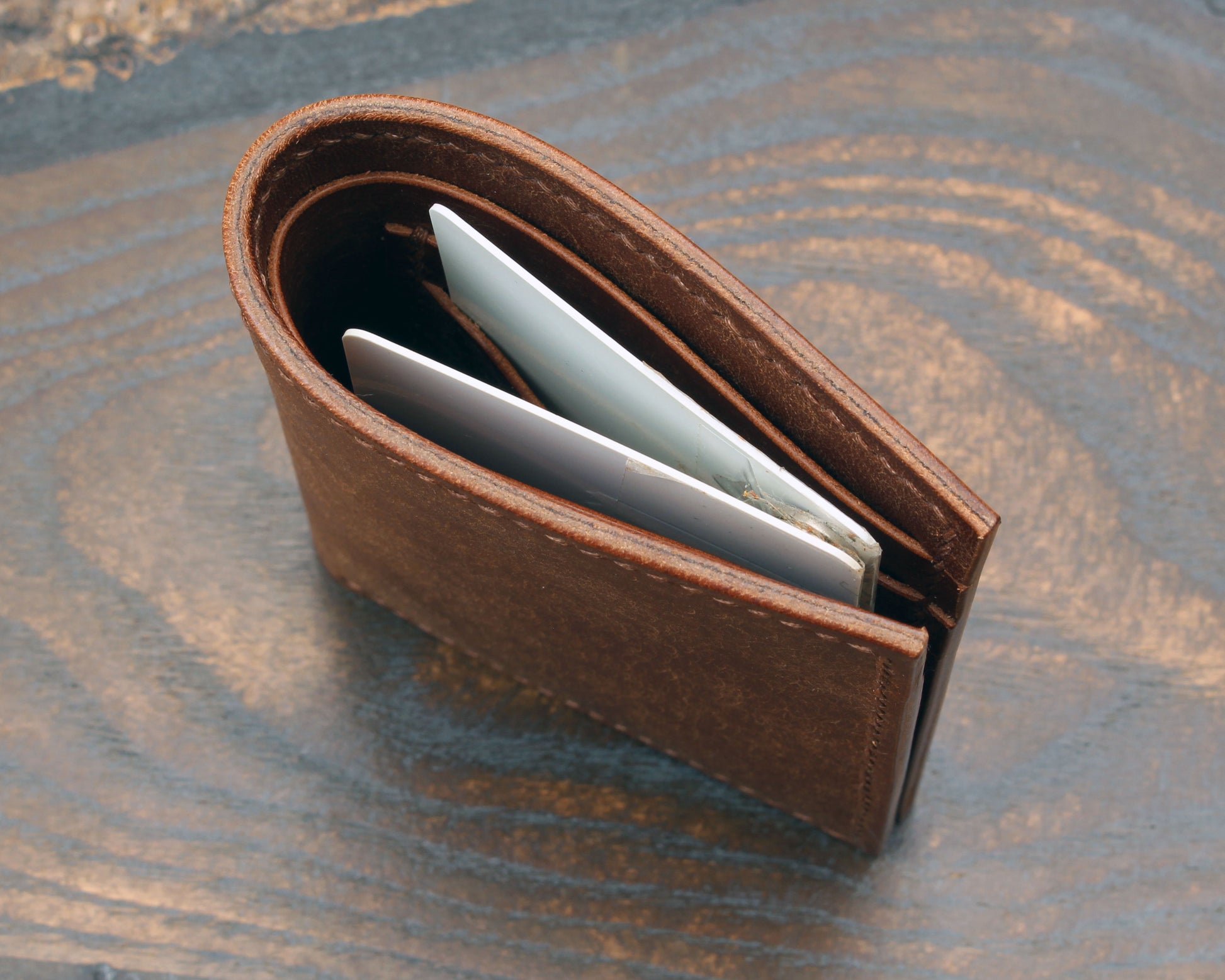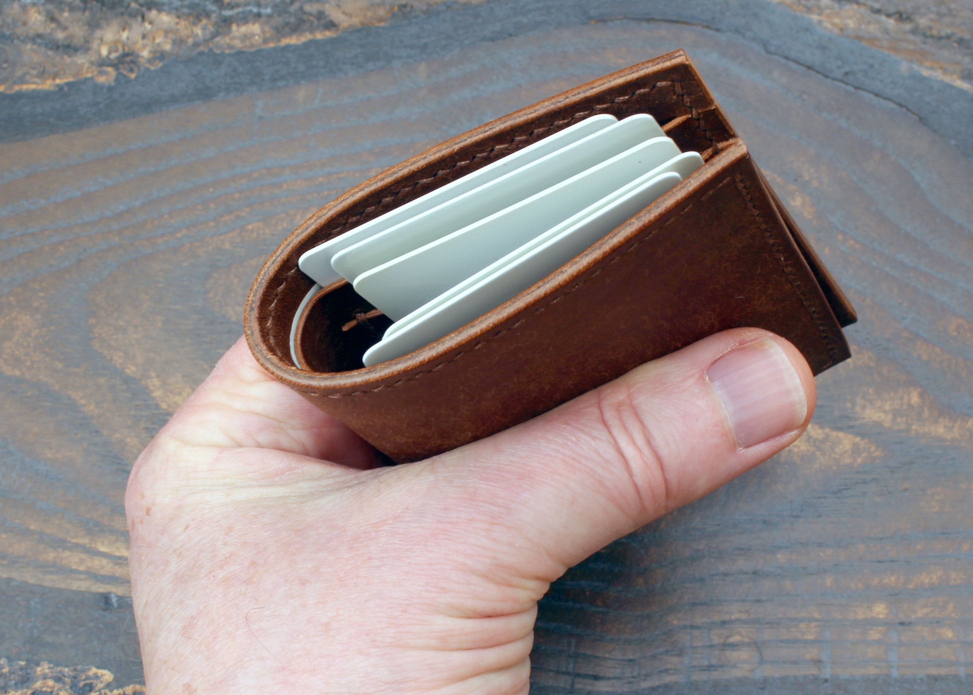 The wallet features two card slots on each side and a full-width pocket behind. The front slots are snug at first but break in nicely, while internal stitching on the back pockets raises the cards slightly for easier access. The larger rear pocket fits extra cards, halved banknotes, or receipts.