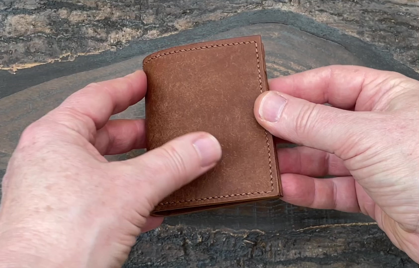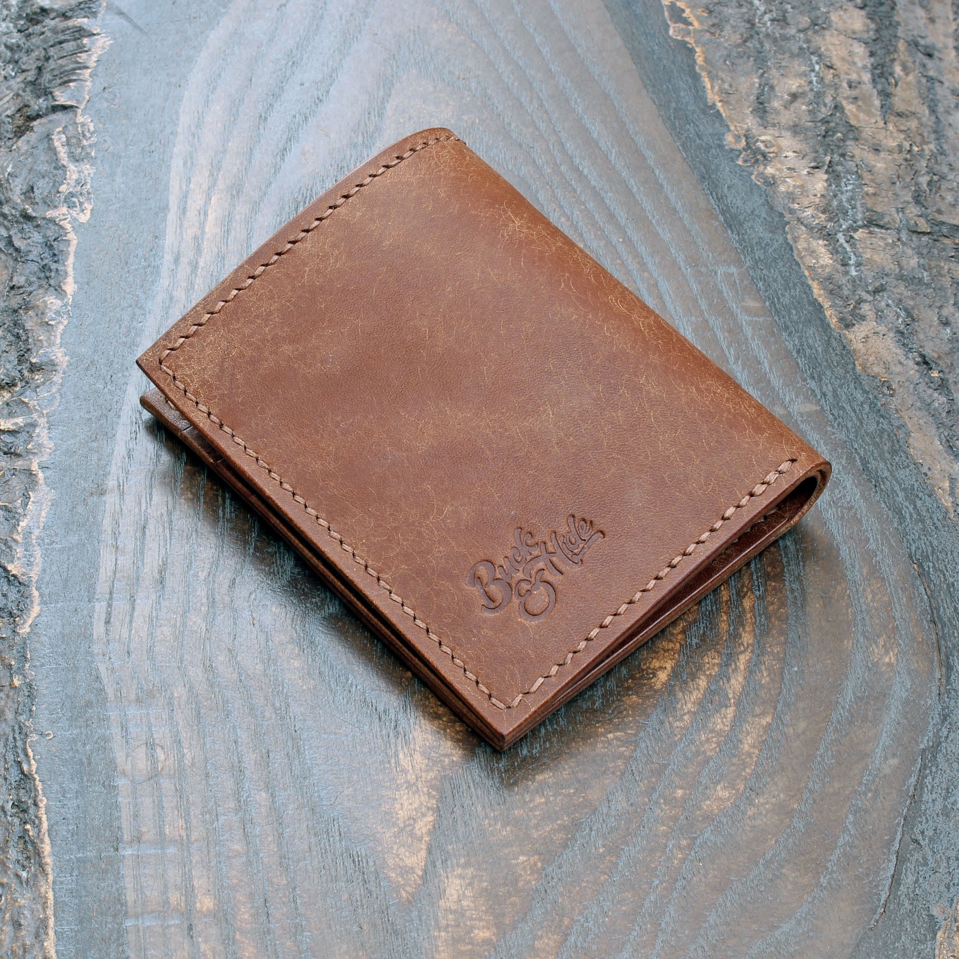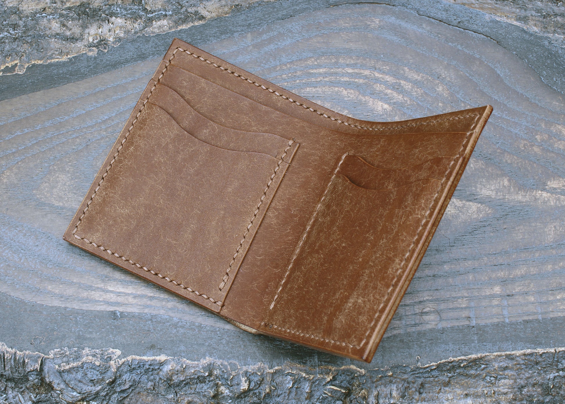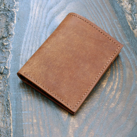 A compact card holder wallet handmade in walnut Pueblo leather from the Badalassi Carlo tannery in Italy. Pueblo starts with a matte, marbled finish and develops a rich sheen and darker tone over time. It's saddle-stitched by hand using brown Vinymo thread from Japan.