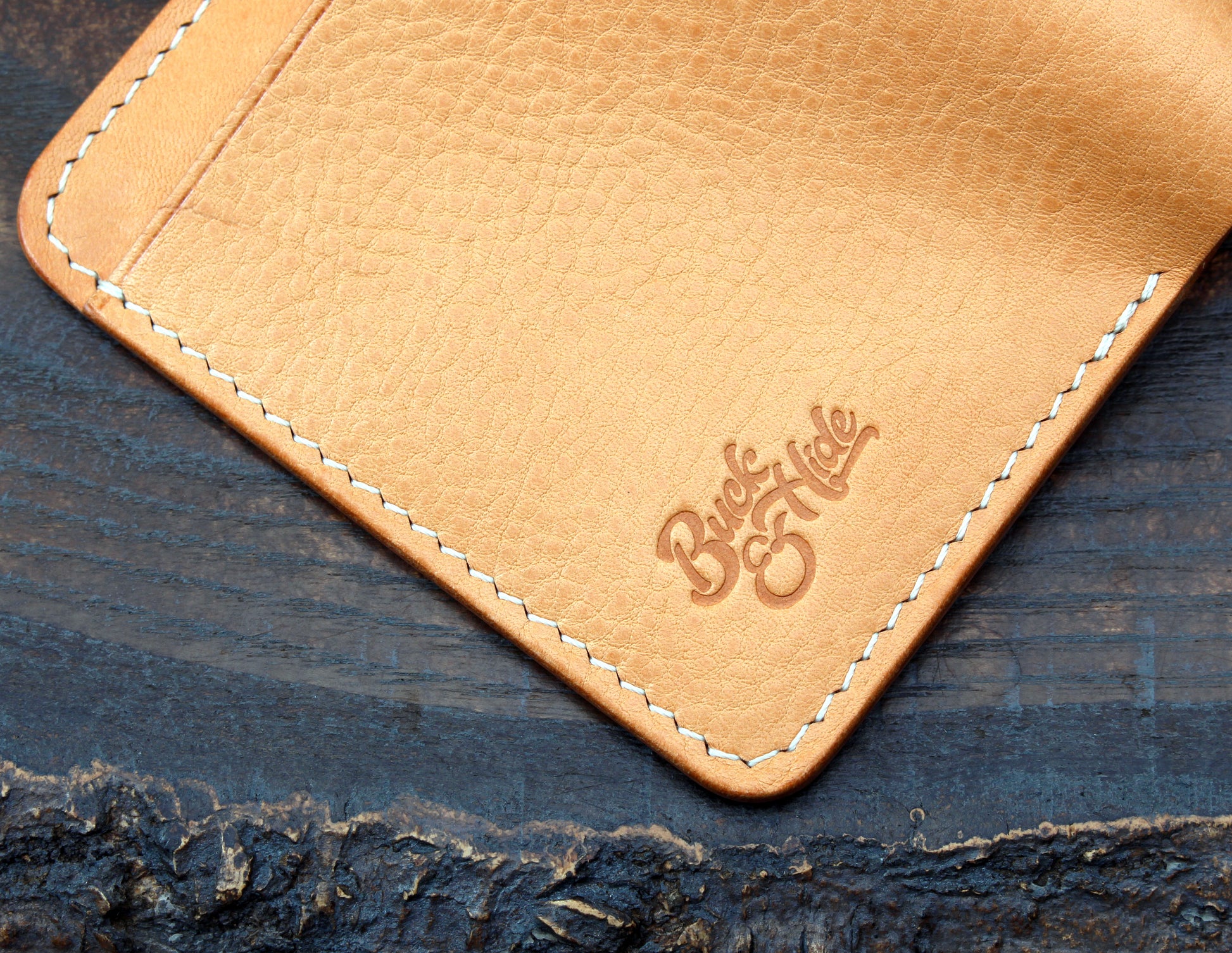 A bi-fold card wallet made using Minerva Box veg-tan leather shoulder in the natural colour. Minerva Box comes from the Badalassi Carlo tannery in Italy. It's a beautifully soft tumbled leather with a dry milled finish which gives it a natural pebble surface and a lived-in appearance.