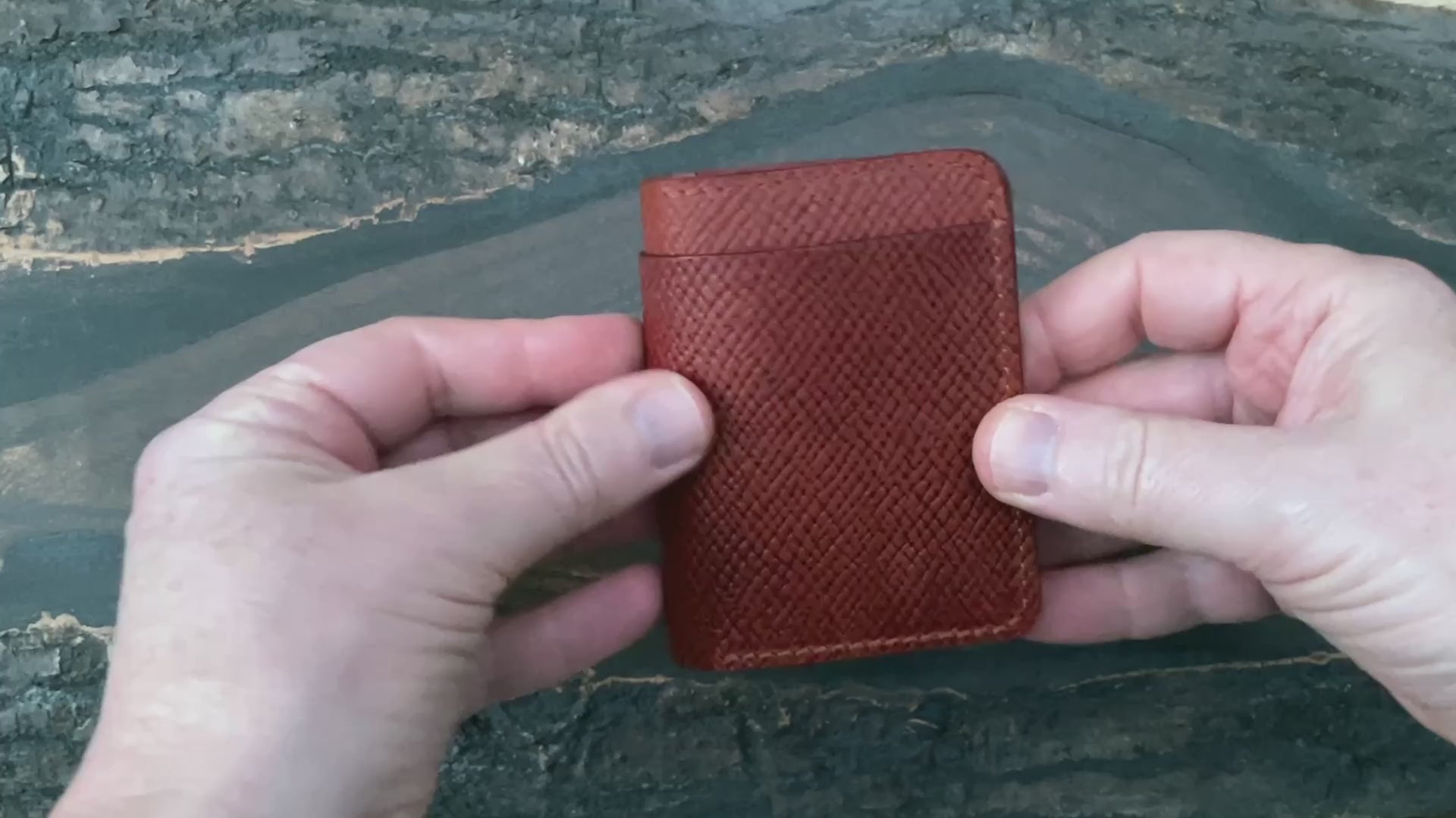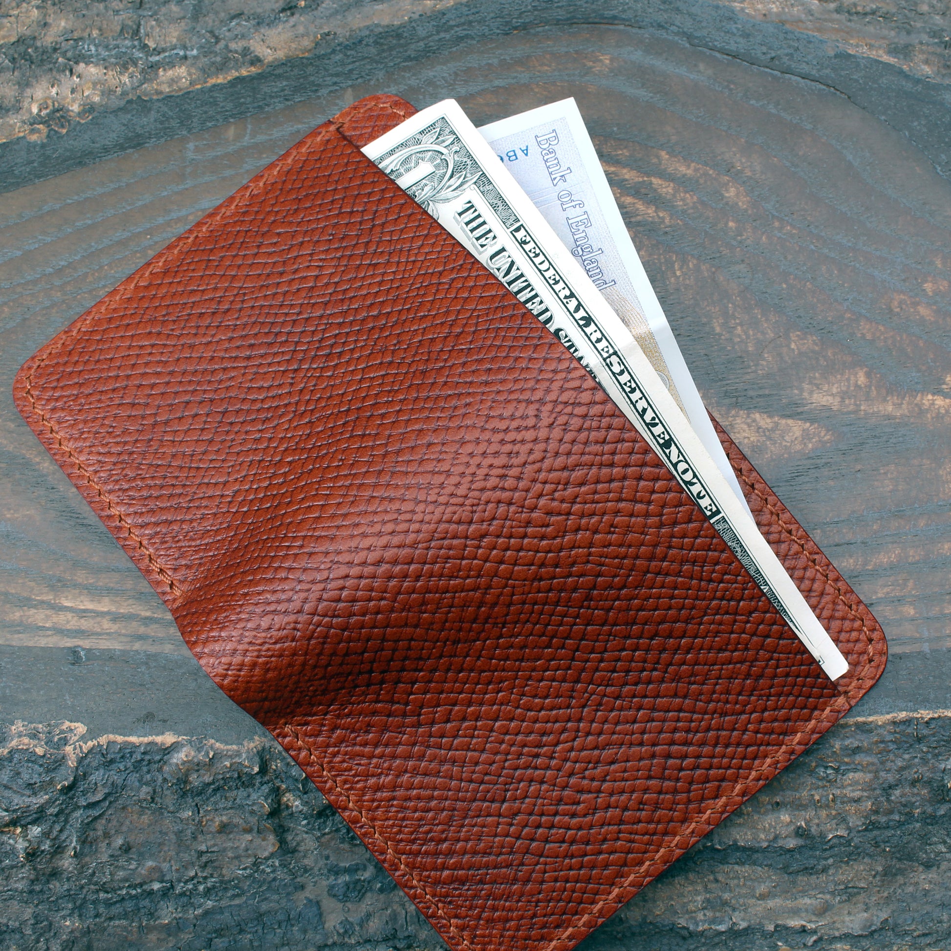 This wallet gives you a large, full-width pocket on the outside for bank notes including USA dollars, more cards, receipts etc and 4 interior card slots. The card pockets have internal stitching (hidden by the large outer pocket) so cards won't slip down further than shown. It's all saddle-stitched together by hand using auburn Vinymo thread from Japan. Overall this is a tactile, practical wallet with a really premium feel.