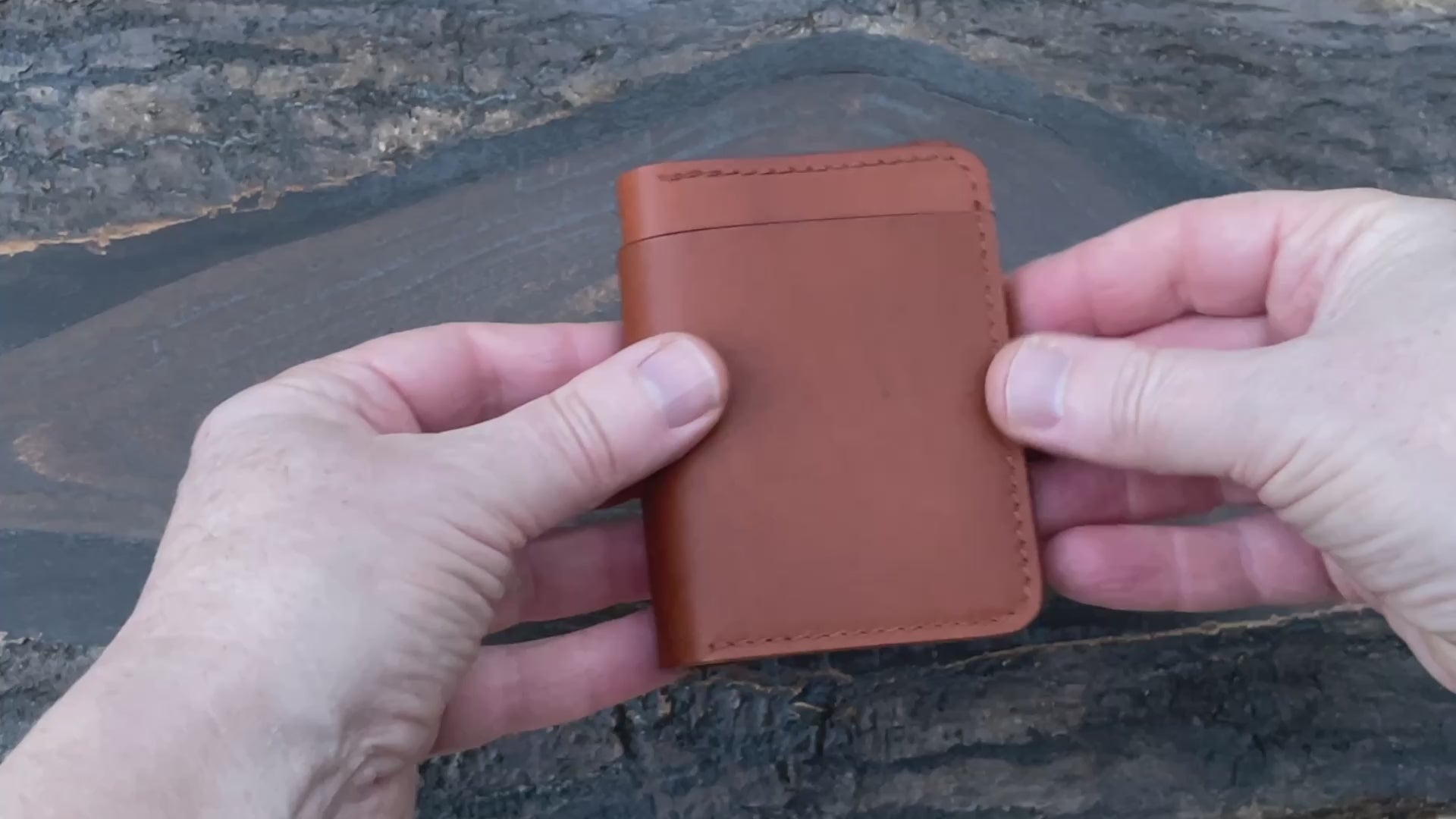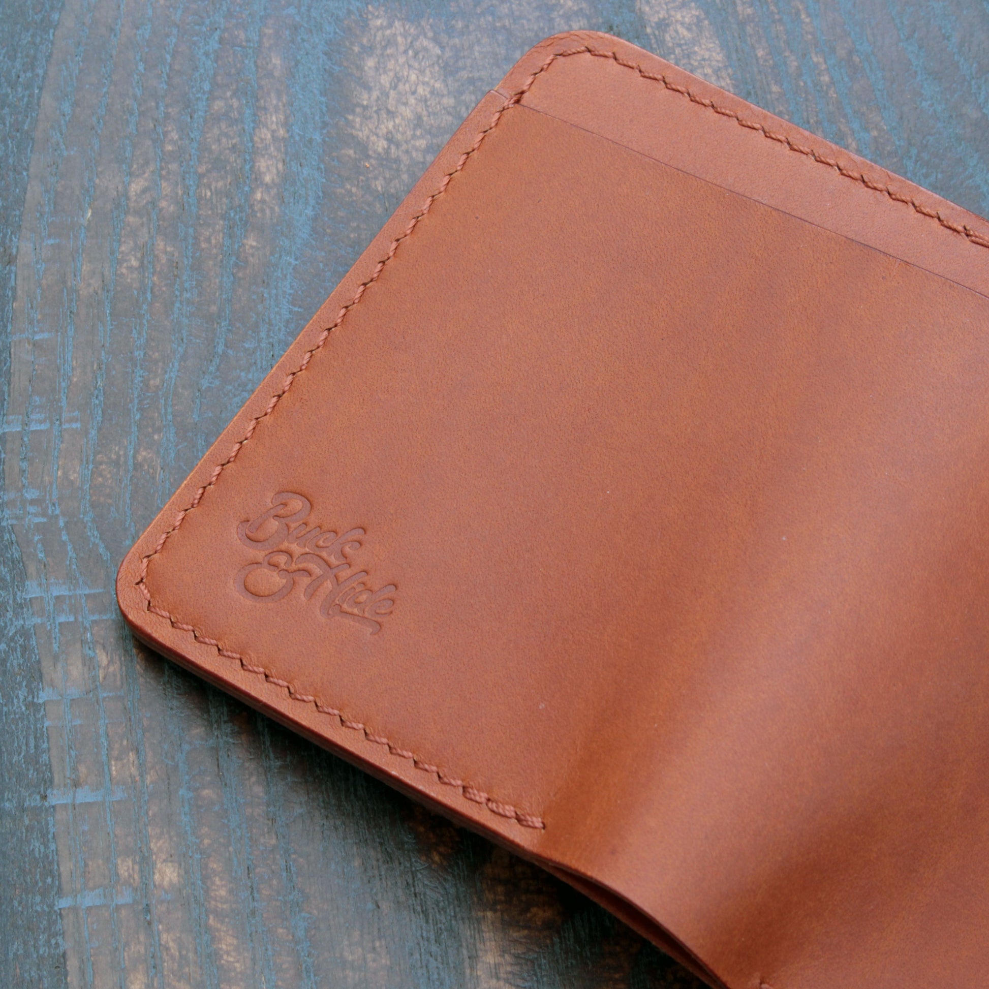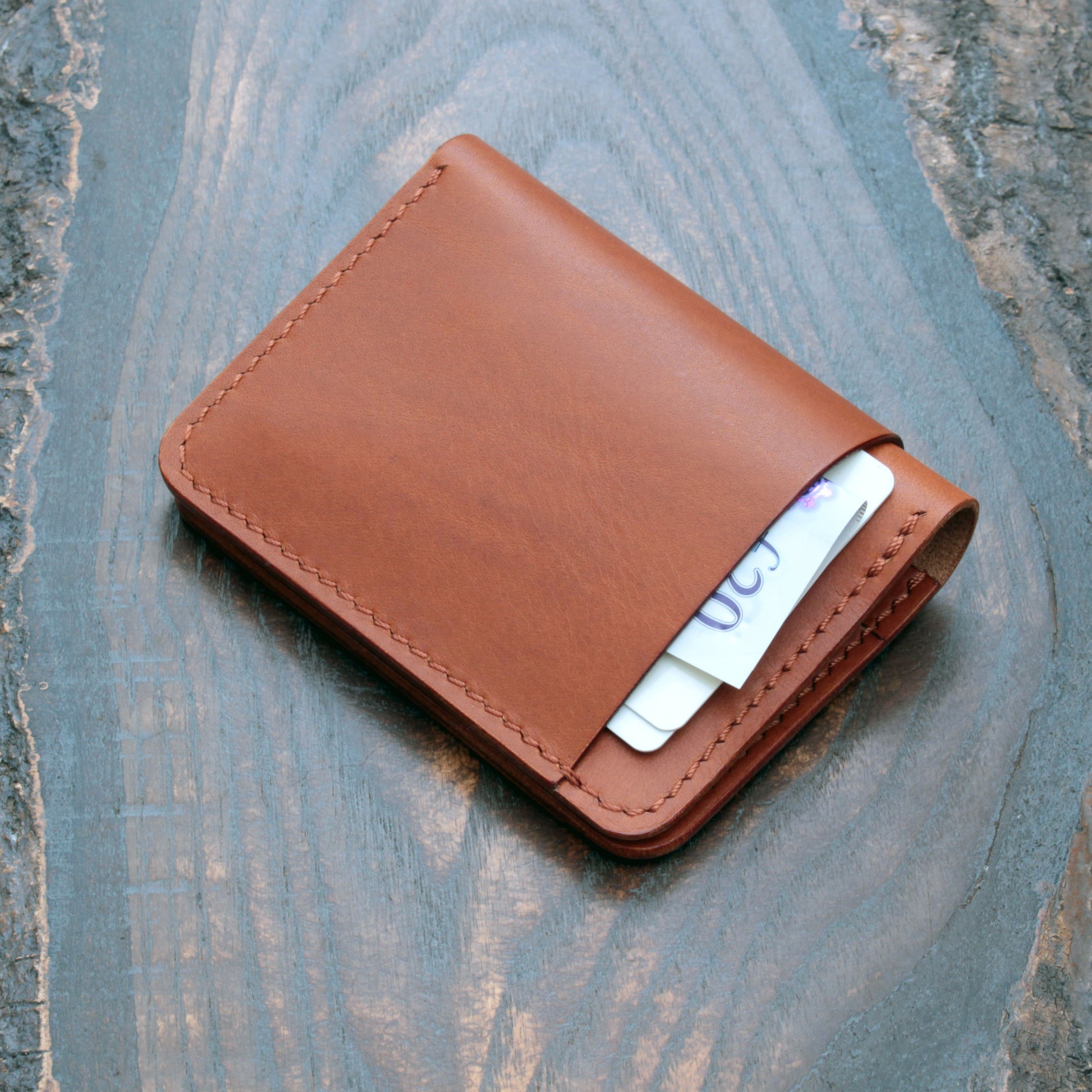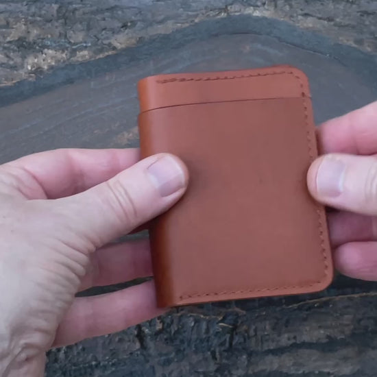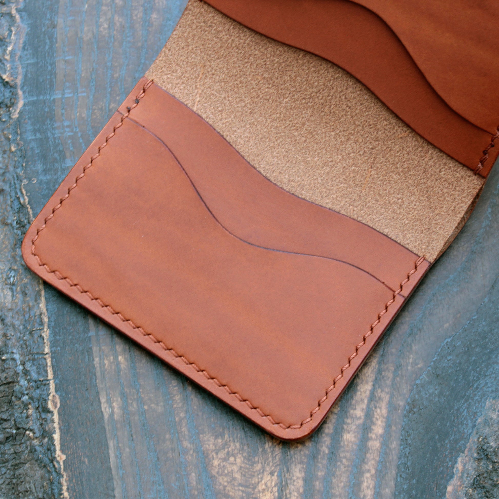 This handcrafted bi-fold card wallet is made from tan Minerva Liscio vegetable-tanned leather by Badalassi Carlo in Tuscany. This premium full-grain leather is drum-dyed for rich, even colour and has a smooth, refined surface with a soft yet structured feel. Over time, it develops a subtle, darker sheen and a beautiful natural patina with use. I've used 2 weights of leather to reduce bulk and saddle-stitched it hand using copper Vinymo thread from Japan.