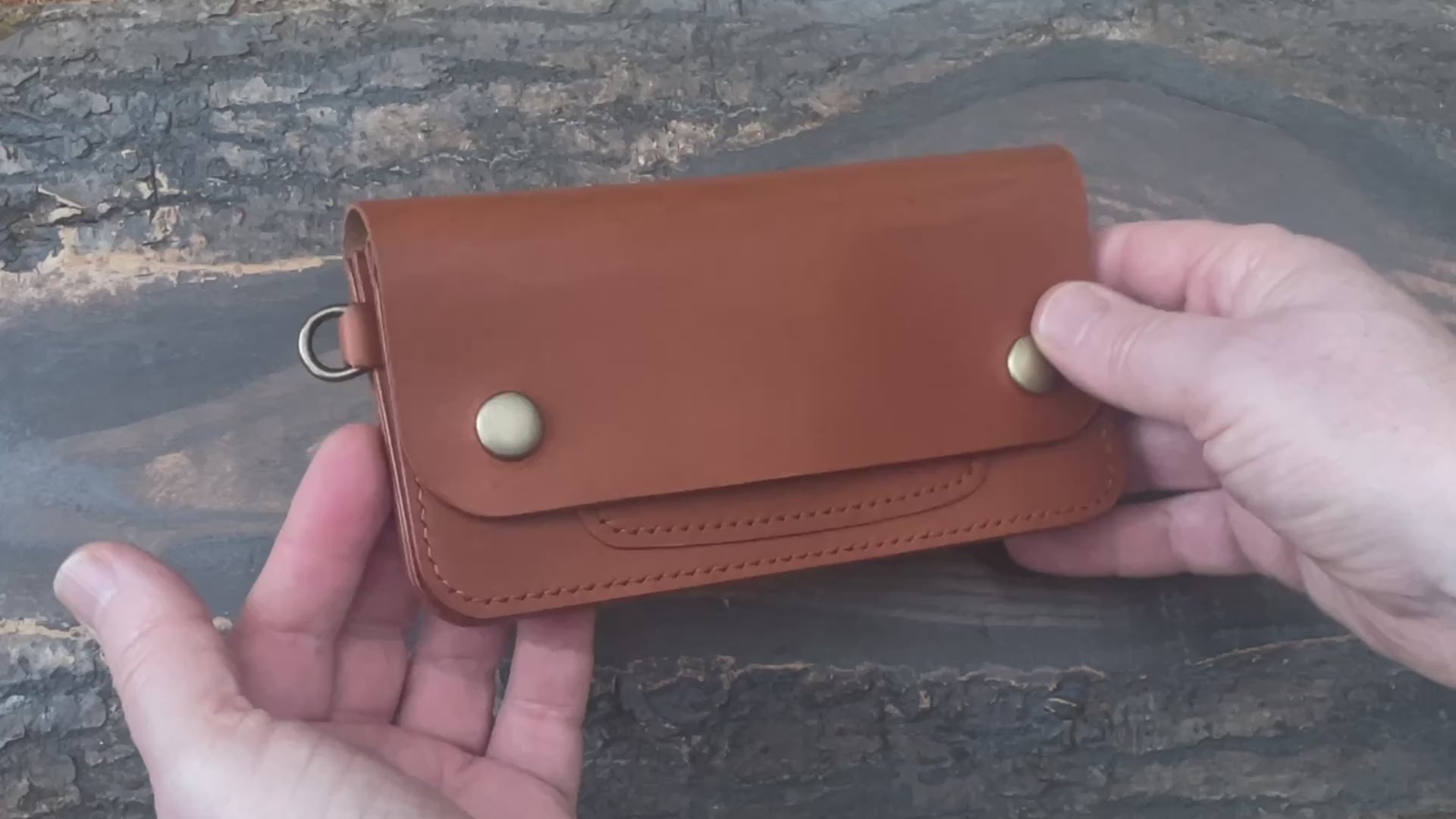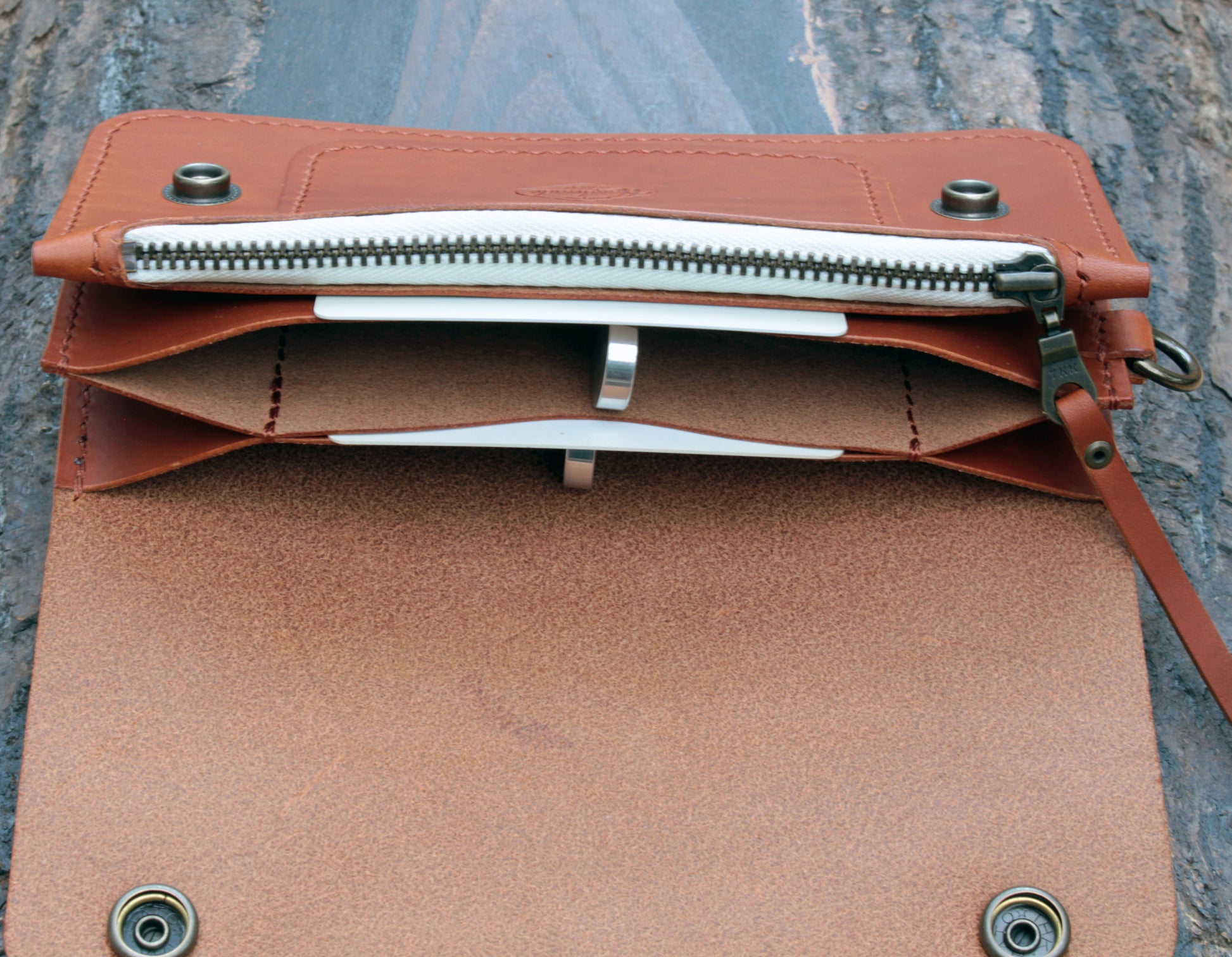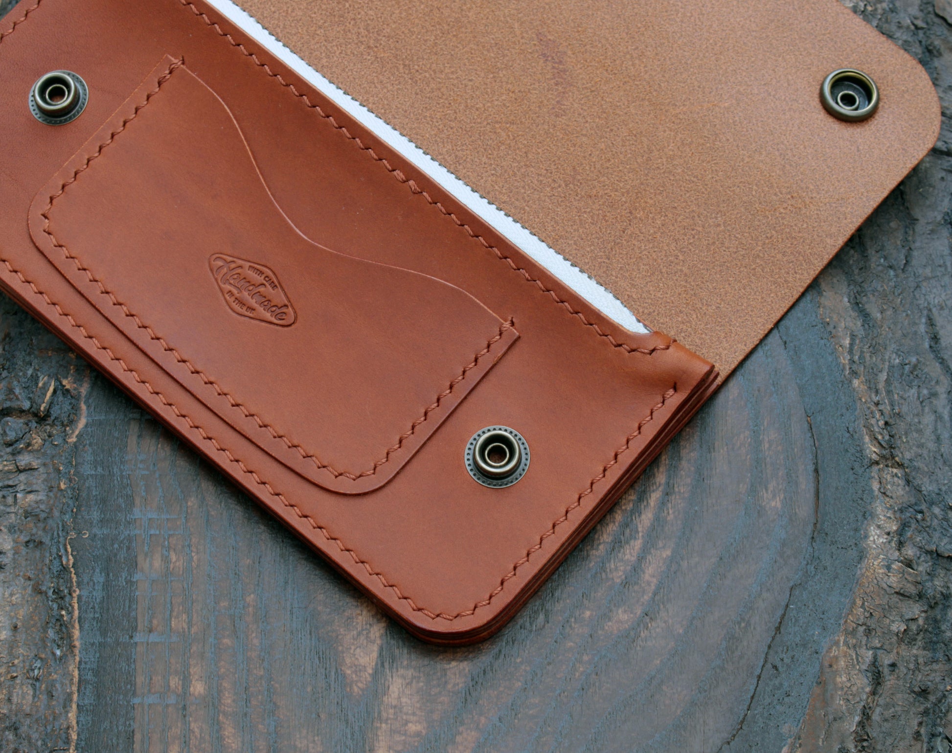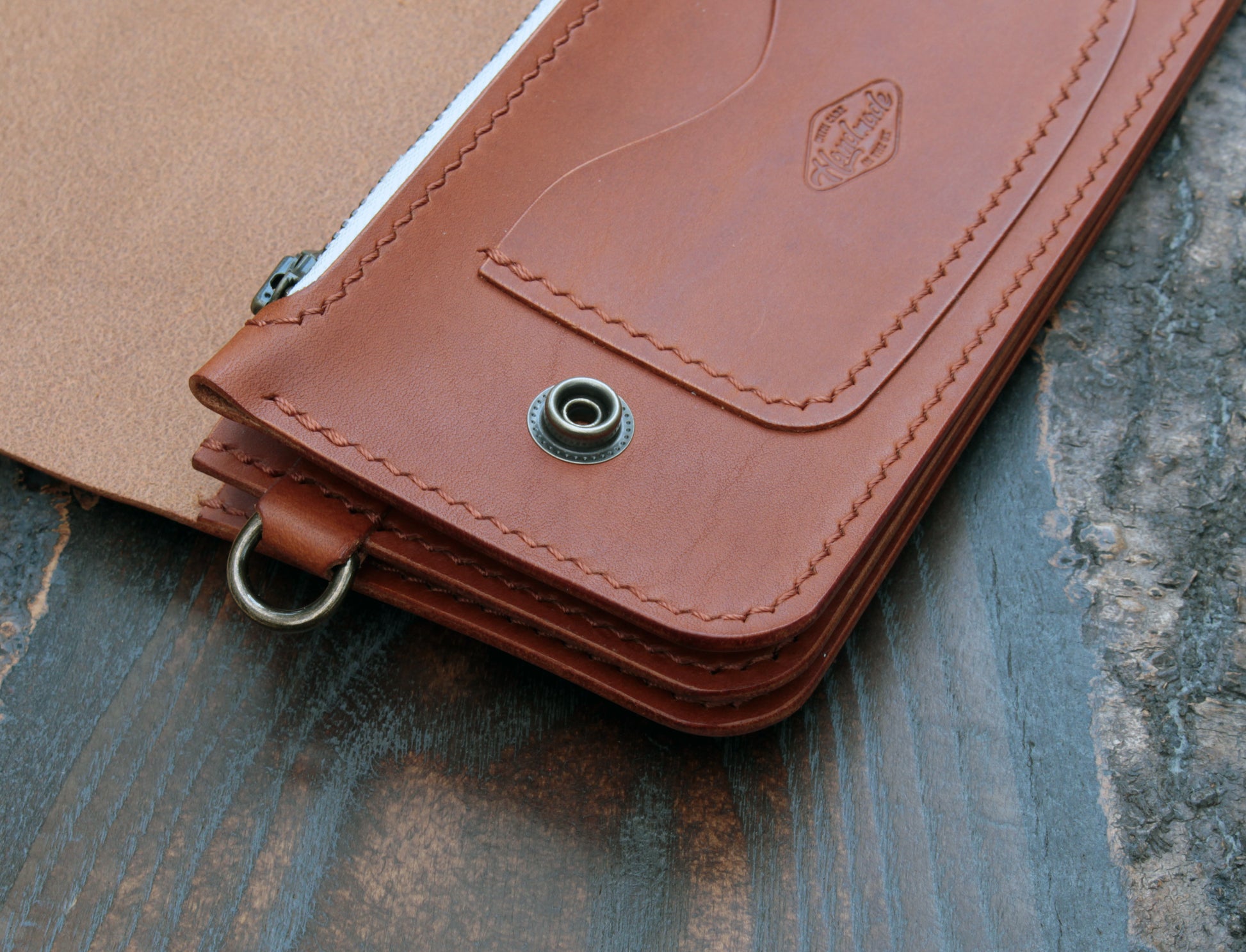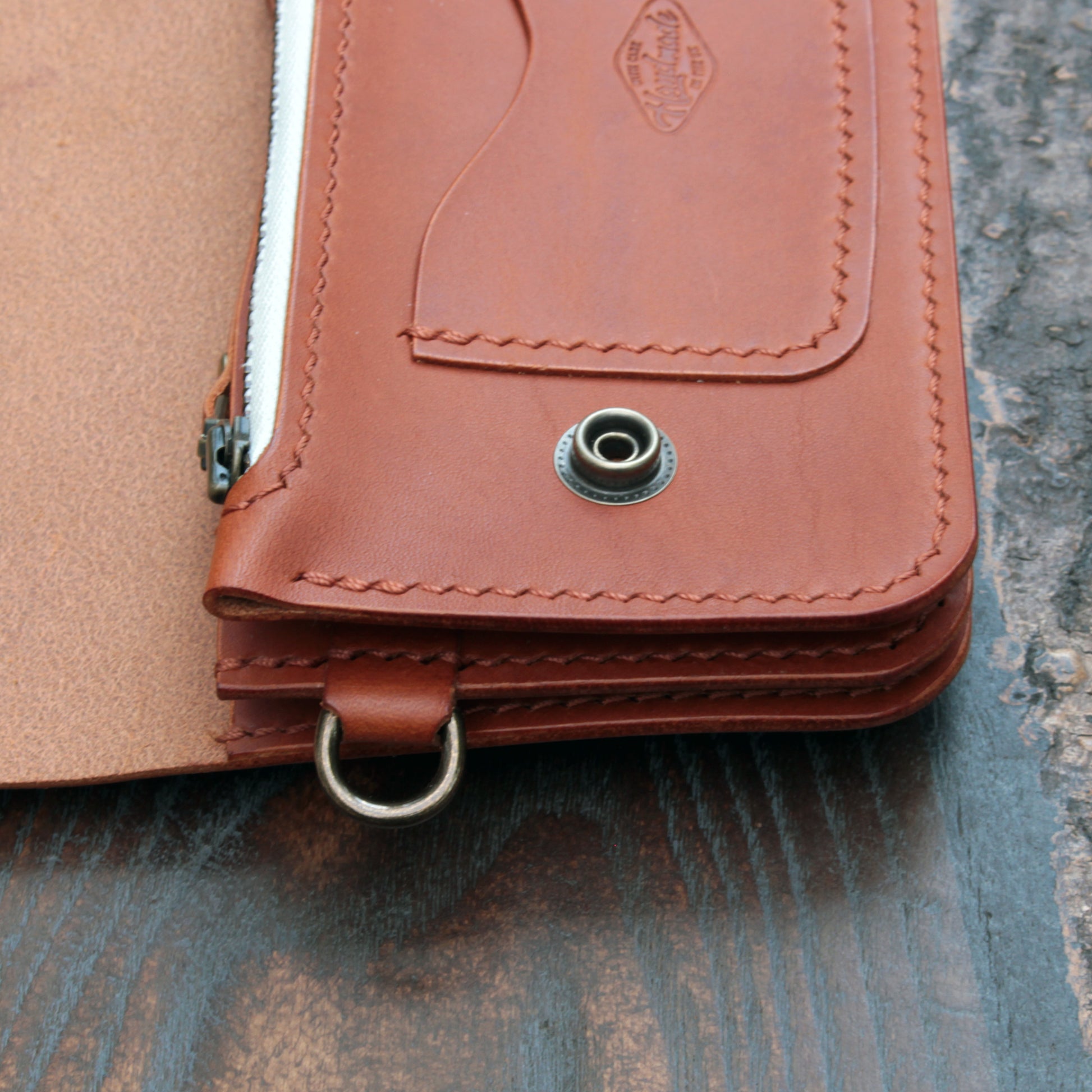 The wallet is saddle-stitched by hand with auburn Vinymo thread from Japan for durability. It’s finished with an antique brass YKK zipper (vanilla cloth) and Hasi-Hato snaps in an antique brass finish. I've also added a D-ring on the side to secure a wallet chain if desired.