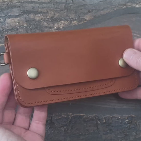 A stunning long trucker/biker-inspired wallet handcrafted from cognac Minerva Liscio leather. Coming from the Badlassi Carlo Tannery in Tuscany, this 100% vegetable-tanned leather has a smooth, matte finish and a beautifully soft temper. Over time it will darken and develop a patina unique to the owner.