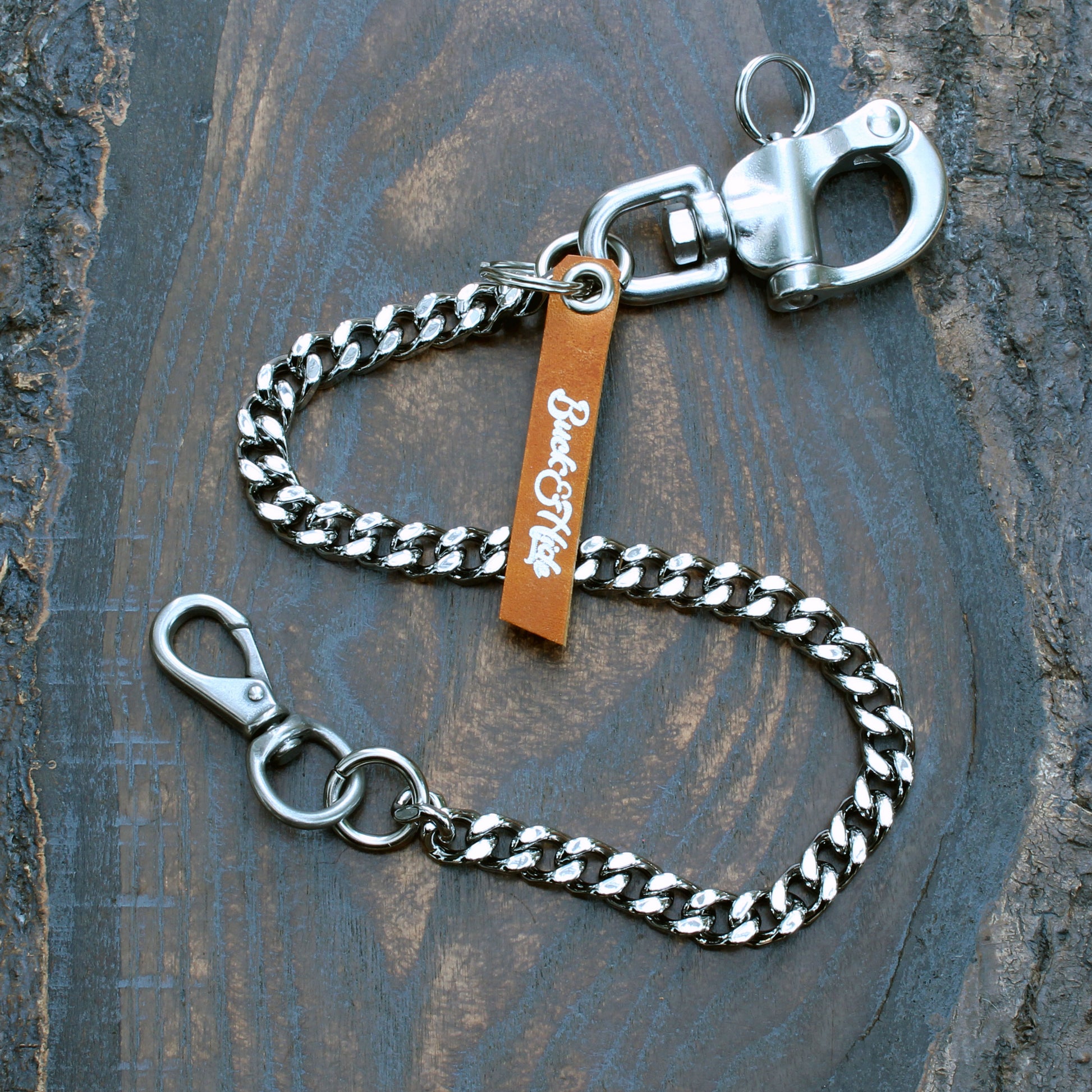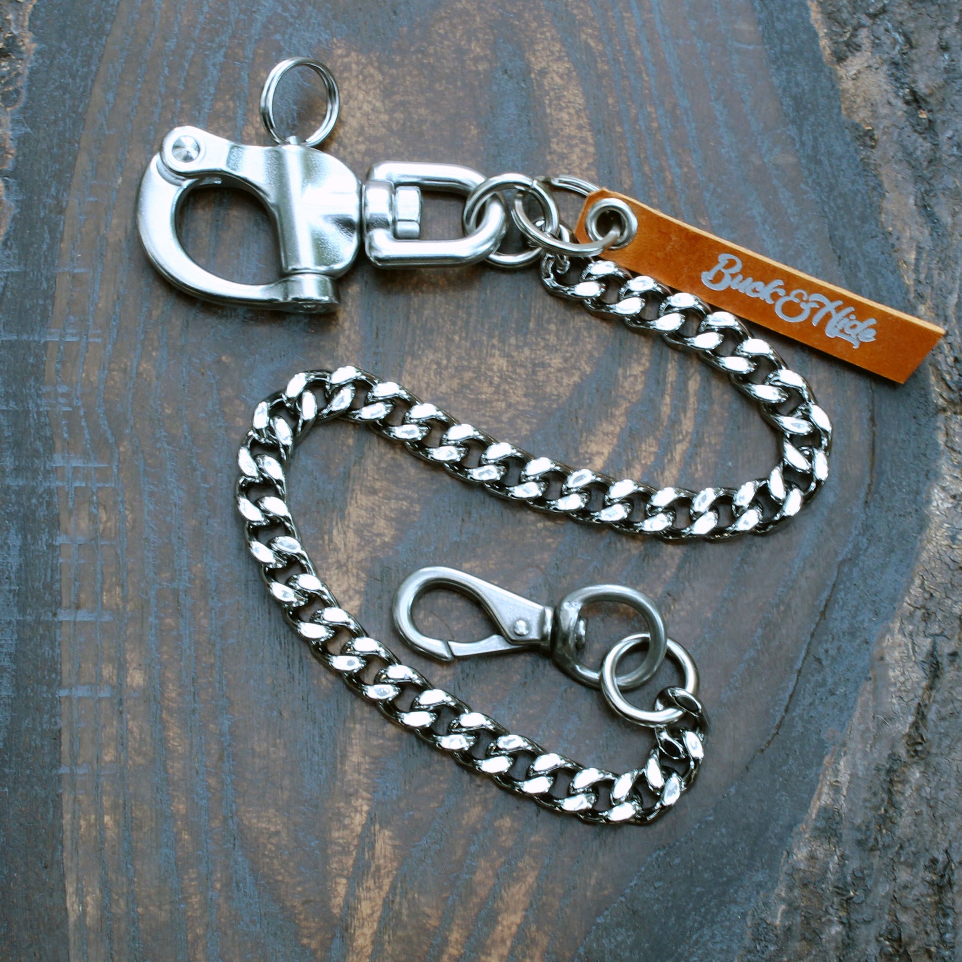 This is a heavier-weight version of my standard wallet and key chains, featuring a nautical-inspired stainless steel pin-opening shackle. The shackle opens by pulling the pin and snaps securely closed when pushed back into place, creating a strong and reliable connection. The opposite end is fitted with a matte nickel trigger clip, chosen to closely match the stainless steel shackle while providing a subtle contrast to the polished silver chain.