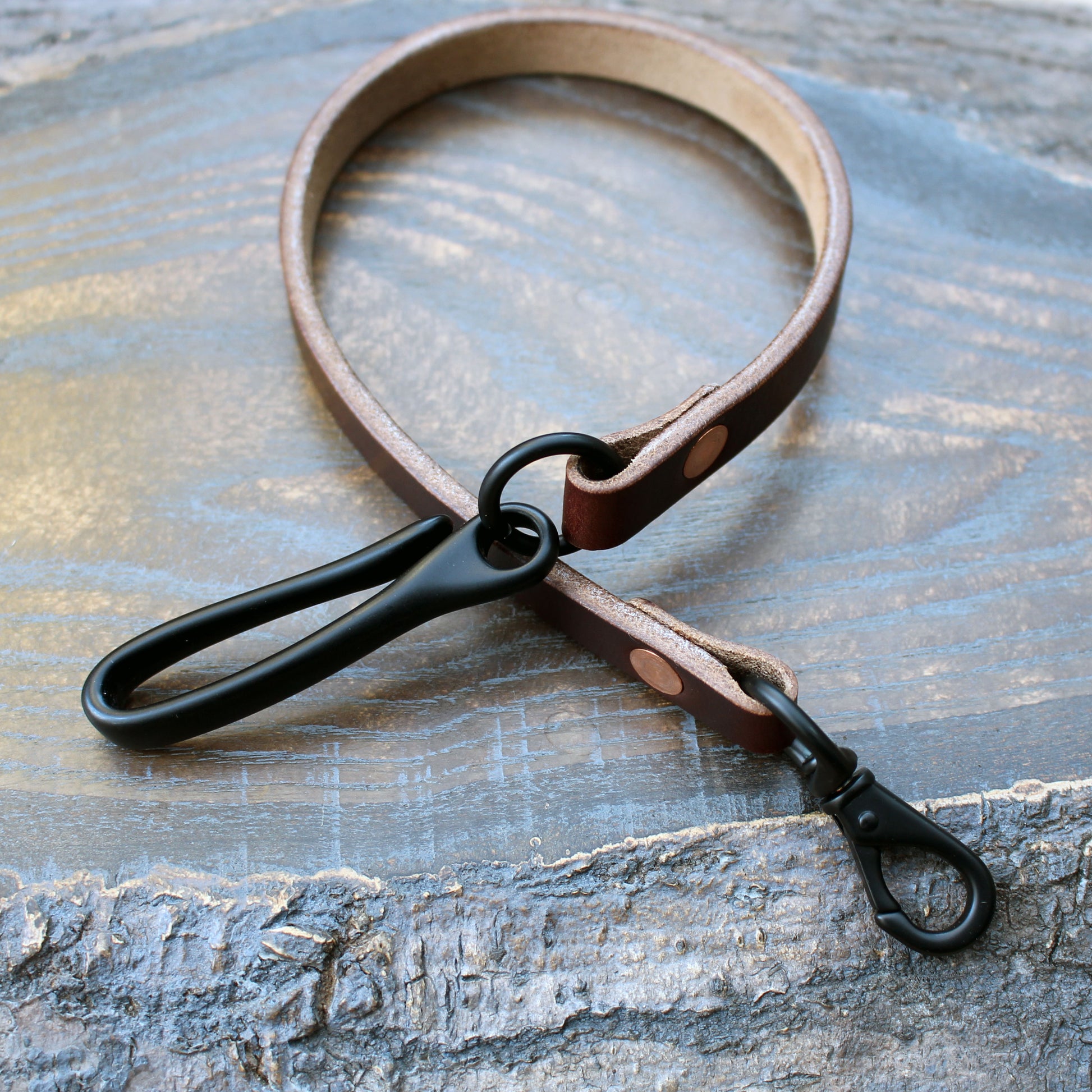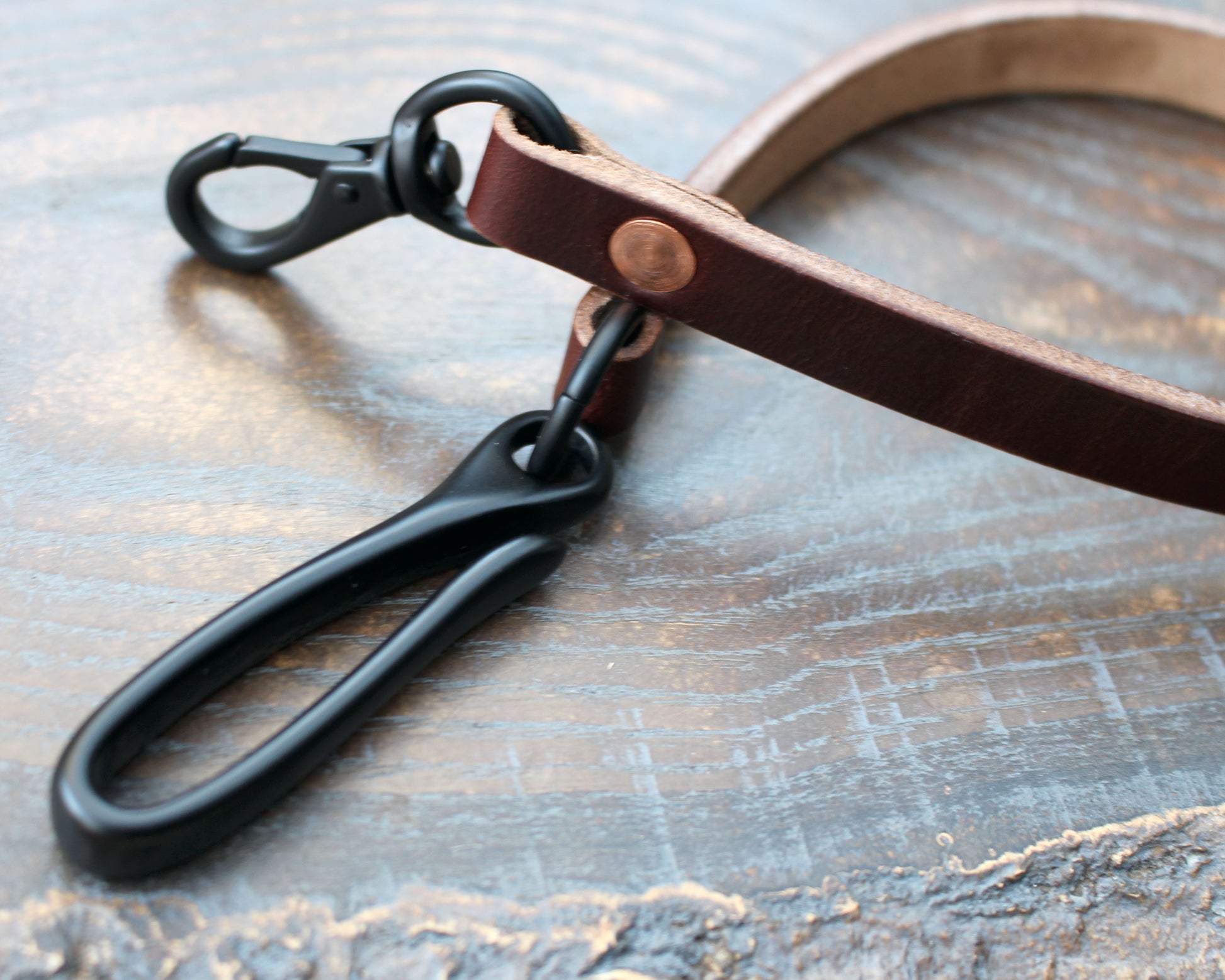 Both pieces of hardware are solid brass with a long-lasting PVD matt black finish, and made in a USA foundry - this finish is hard wearing but does cost slightly more. The Japanese-style fish hook slips through a belt loop or over a belt, and this version has a compact swivel lever clip at the other end. I use copper saddler's rivets to keep everything extra-secure.