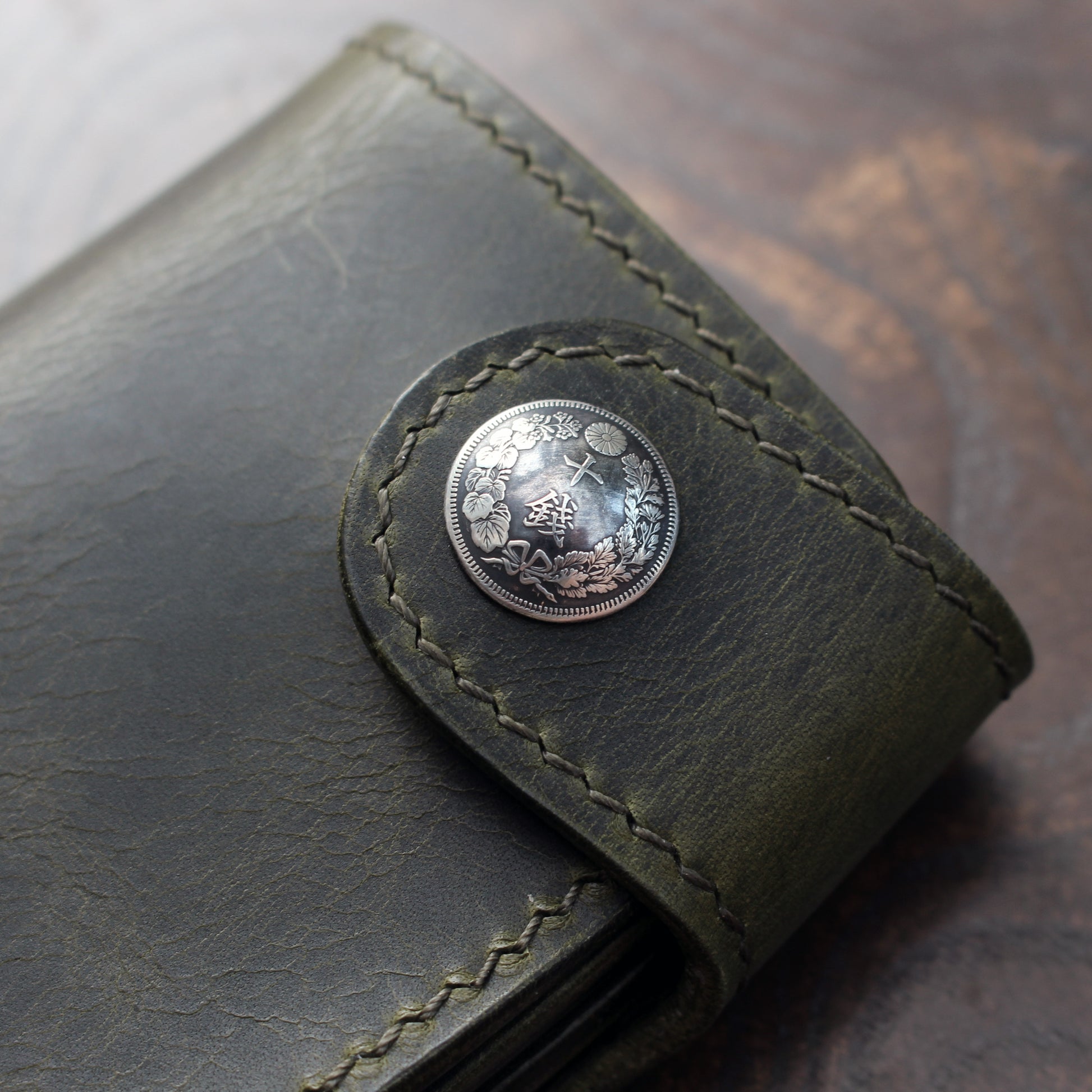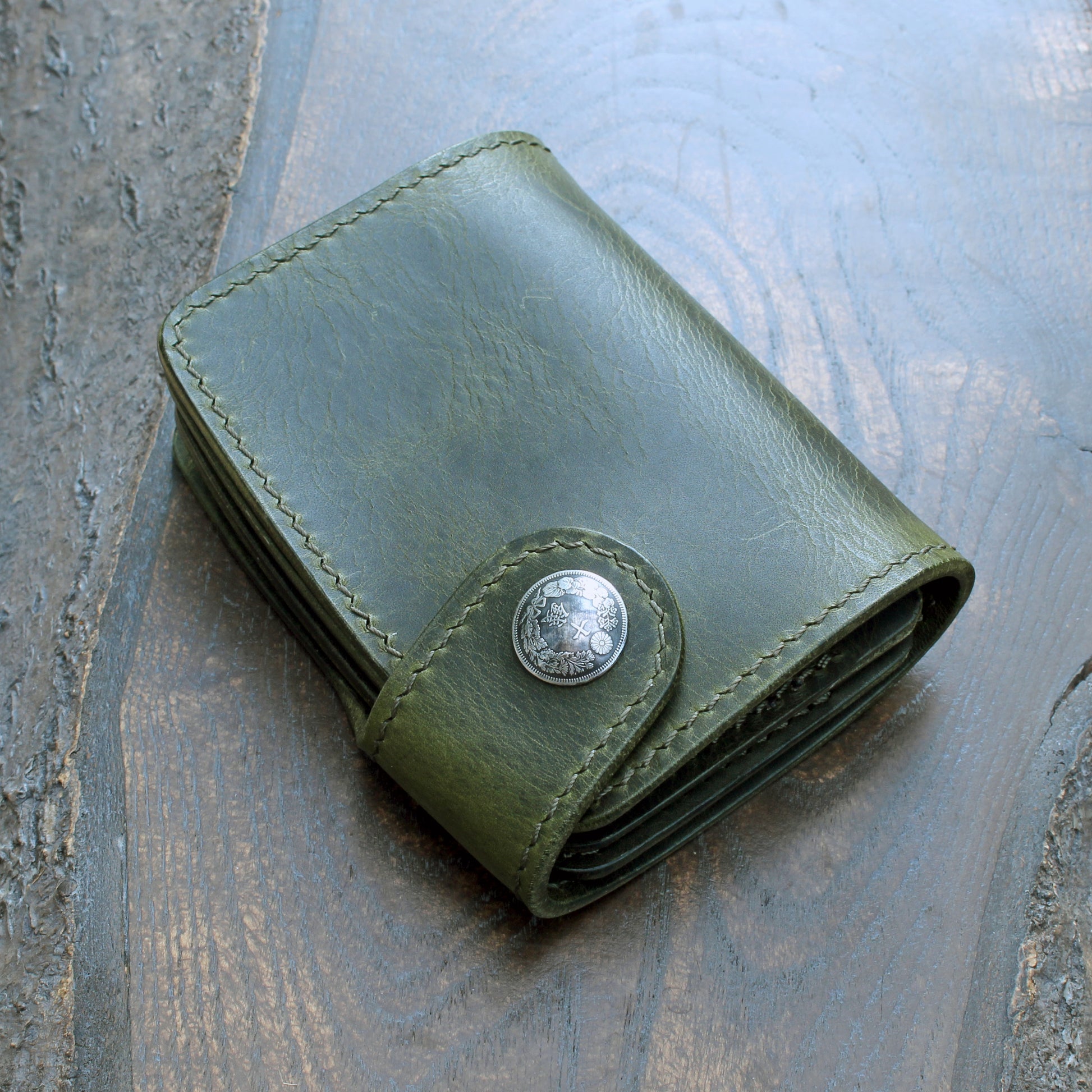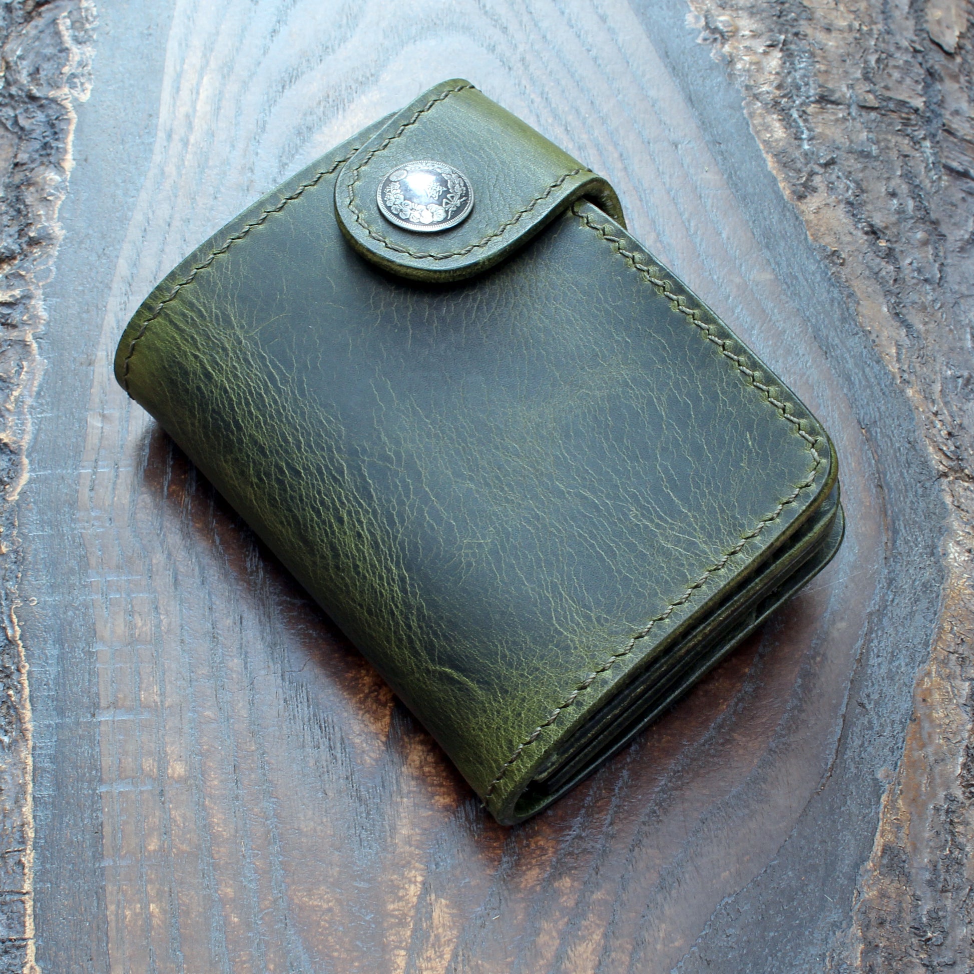 Japanese-style short bifold, olive Wax, vintage coin snap