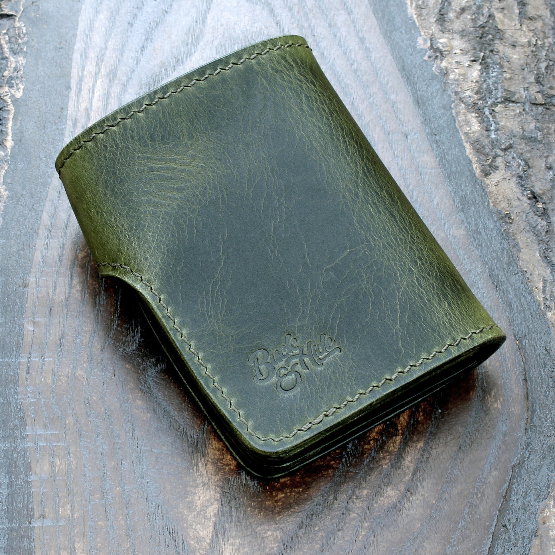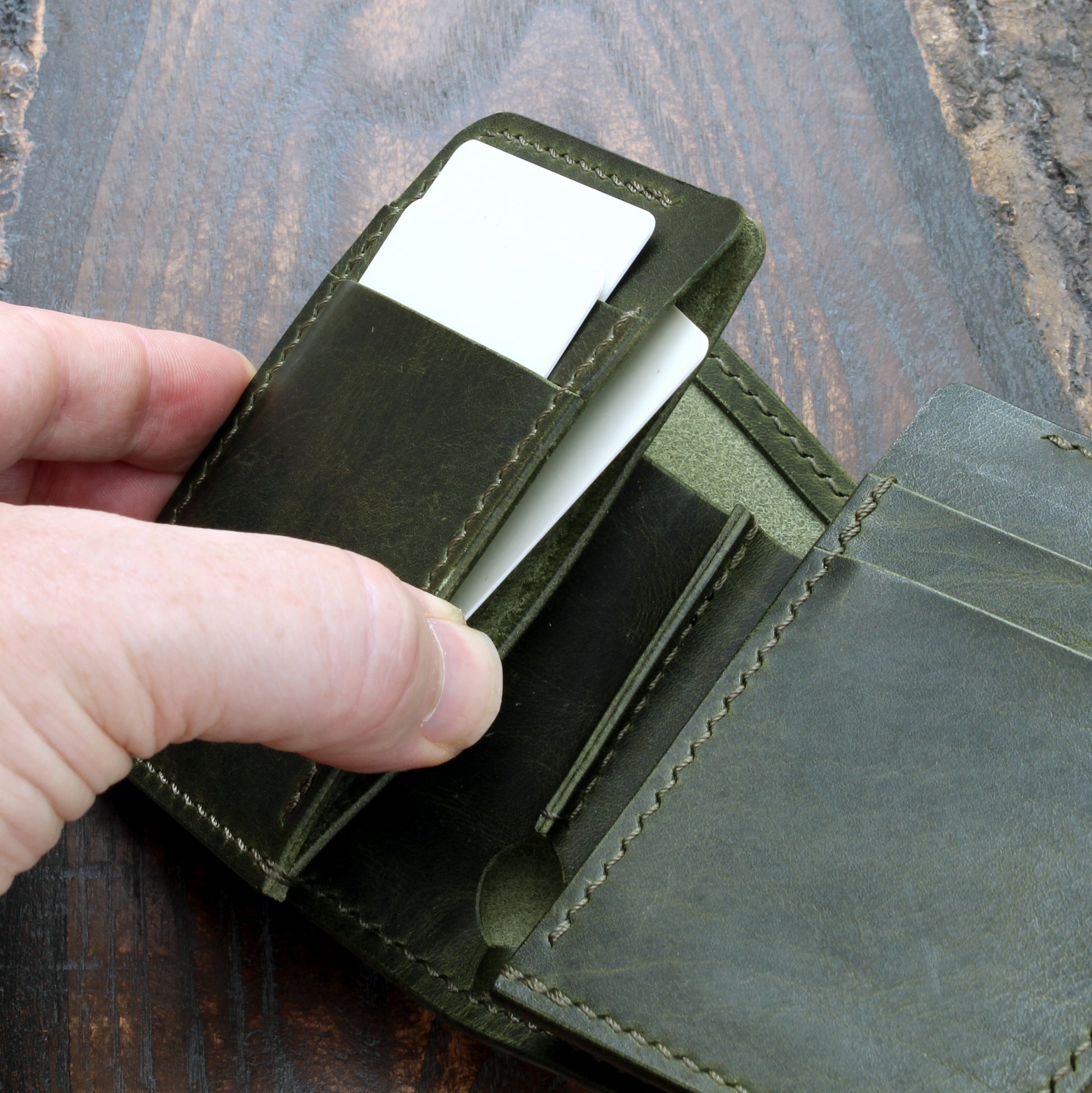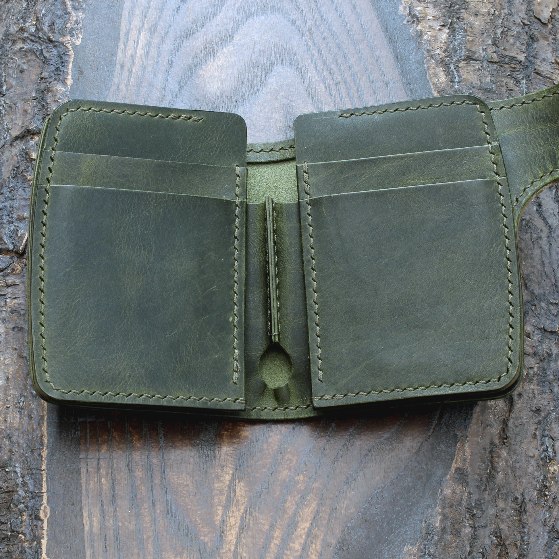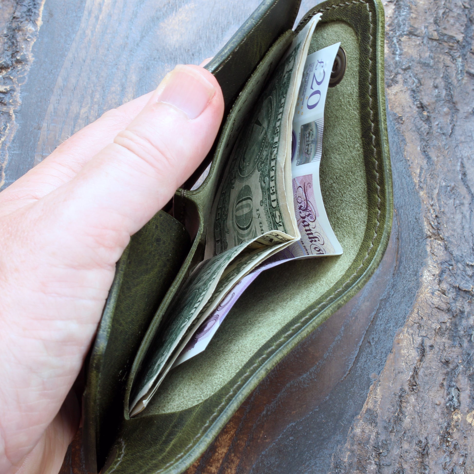 A Japanese-style 'short' wallet made using Badalassi Carlo Wax veg-tan leather in olive green. The Wax is a pull up leather stuffed with oils so it changes colour slightly in areas that are stressed. It's full of natural characteristics giving it a rugged appearance that will patina beautifully. For the outer part of the press snap I've used a modified vintage Japanese coin dating from 1907-1917. It's a 10 sen 'Asahi' coin which is 80% silver (20% copper) so has inherent value. The wallet is saddle-stitched together by hand (no machines!) using olive green waxed Vinymo thread from Japan. All edges are burnished and waxed for a smooth, durable finish.