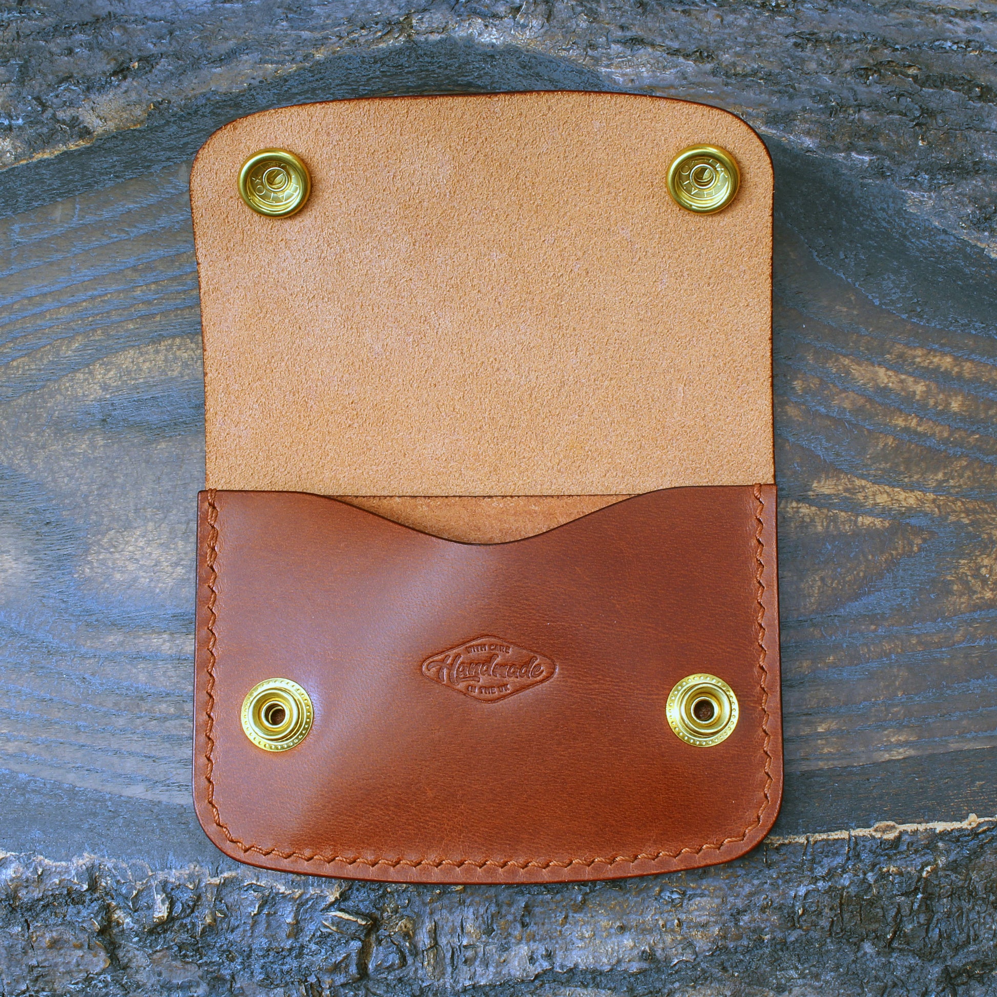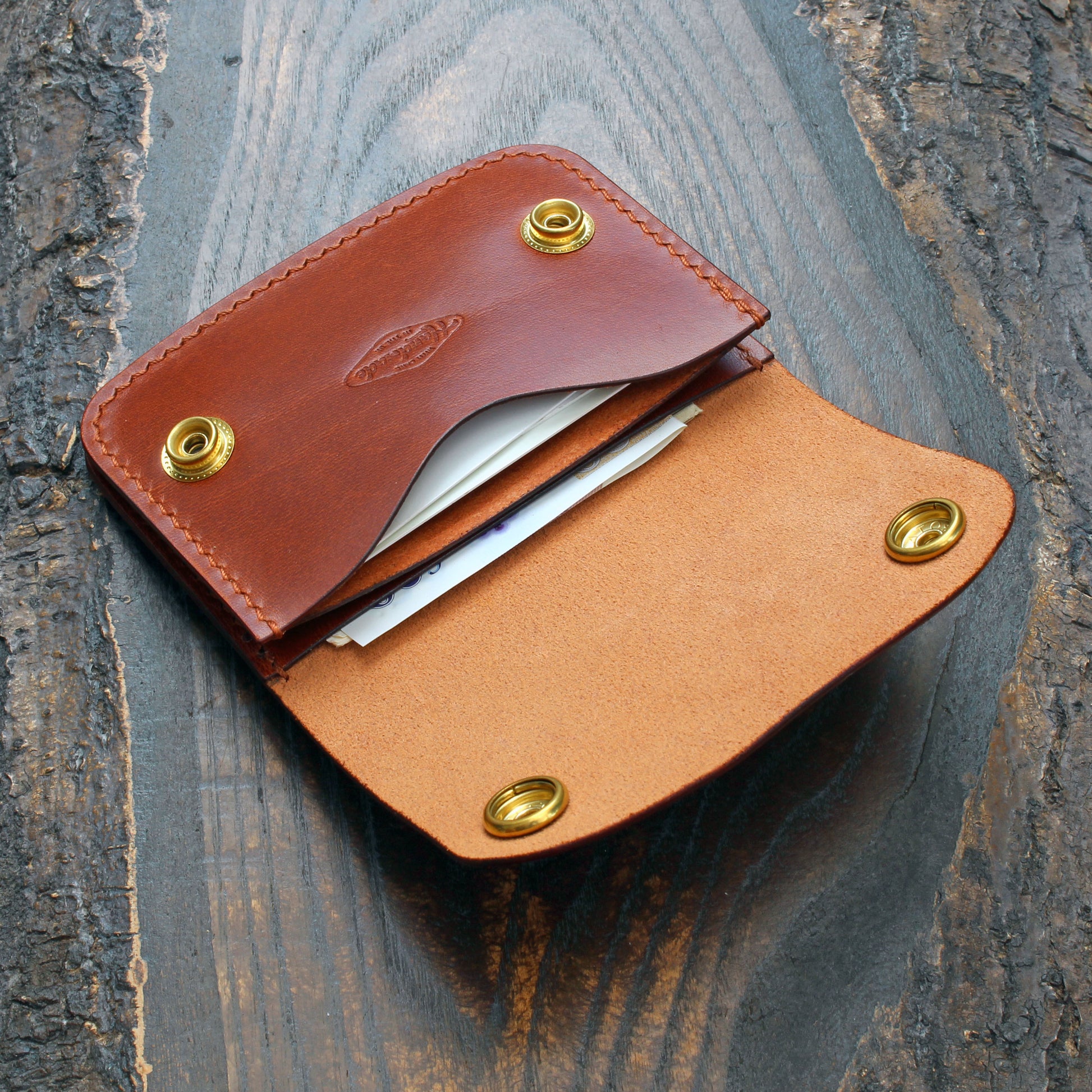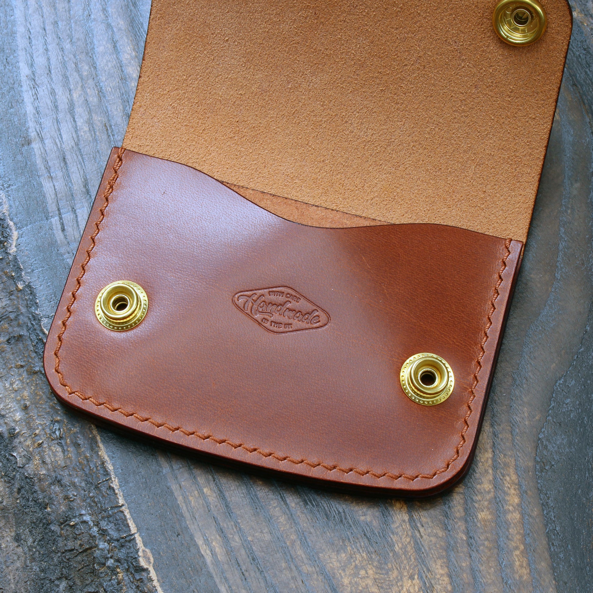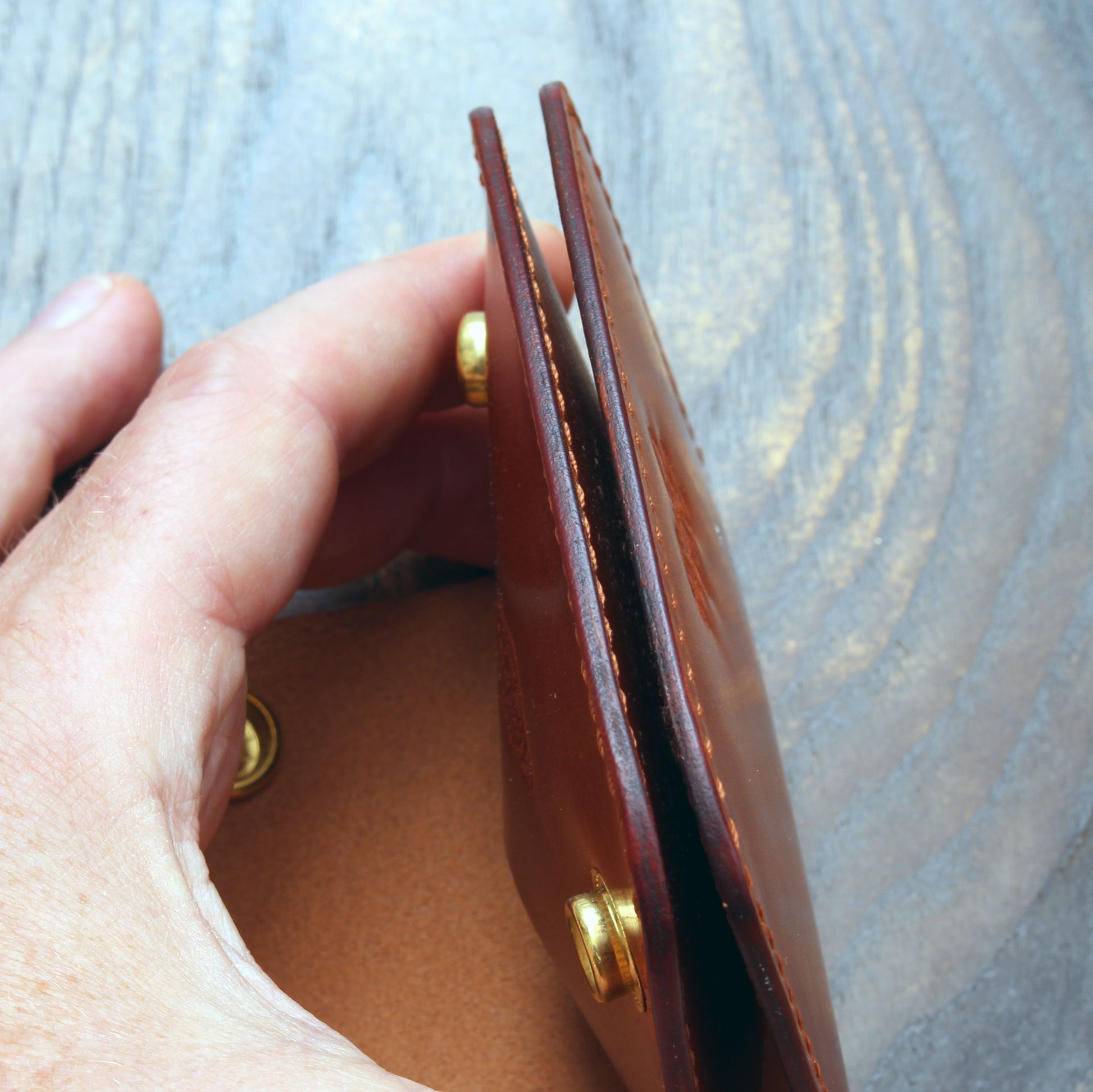 A compact trucker-style snap wallet or purse handmade in Maremma leather in the 'ruggine tan' colour from the Conceria Puccini tannery in Italy. This leather is vegetable-tanned using extracts from a tree renowned for its strength called 'Quebracho'. The leather has a firm feel, a bright glazed finish and a slight pull-up effect.