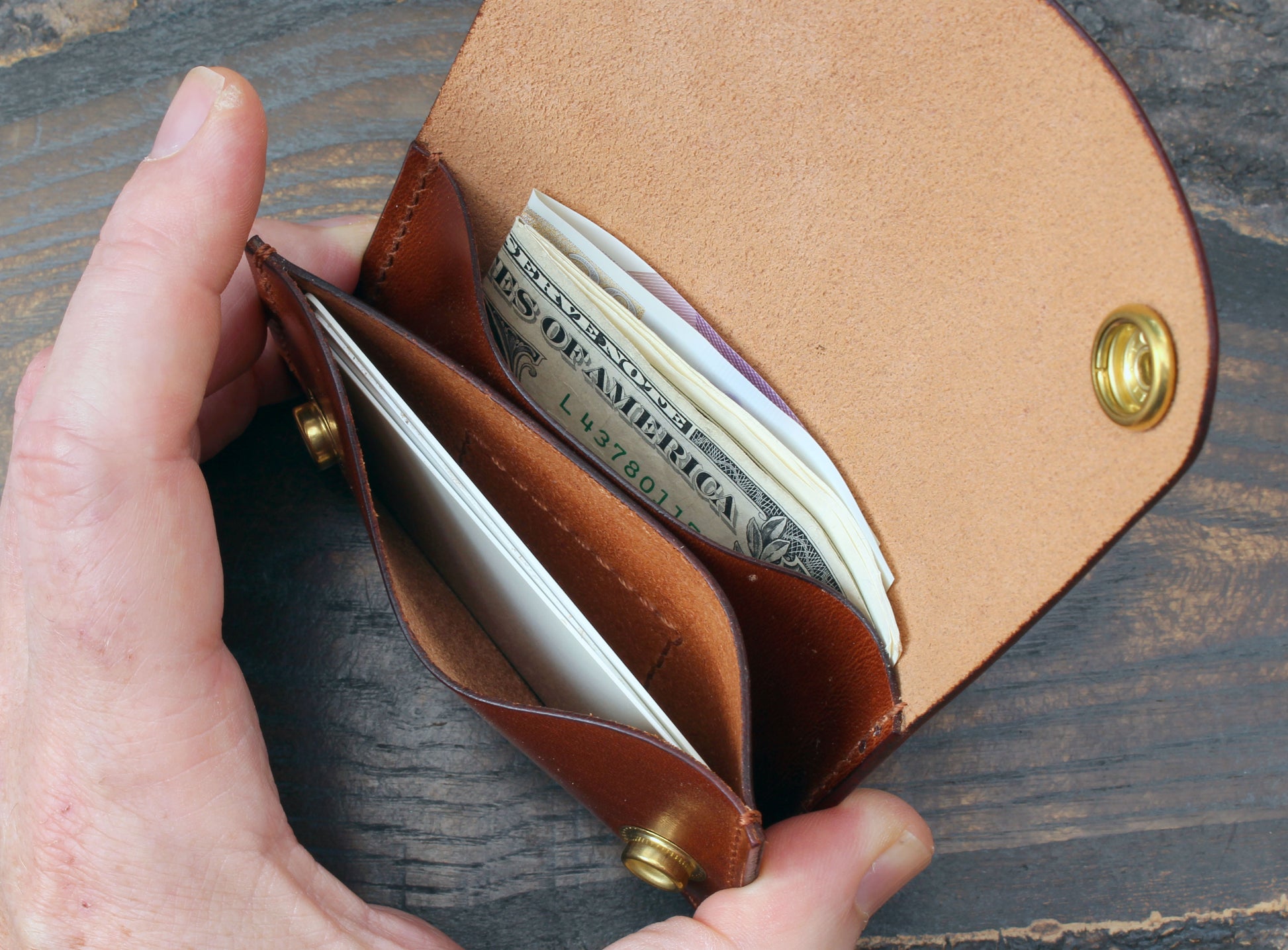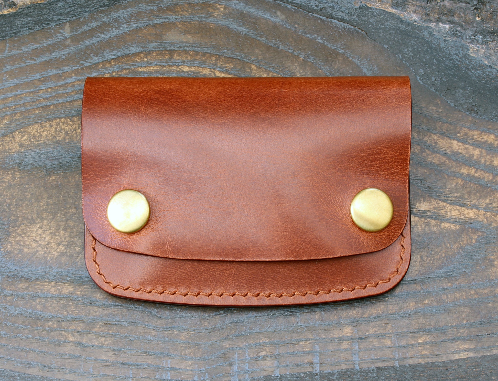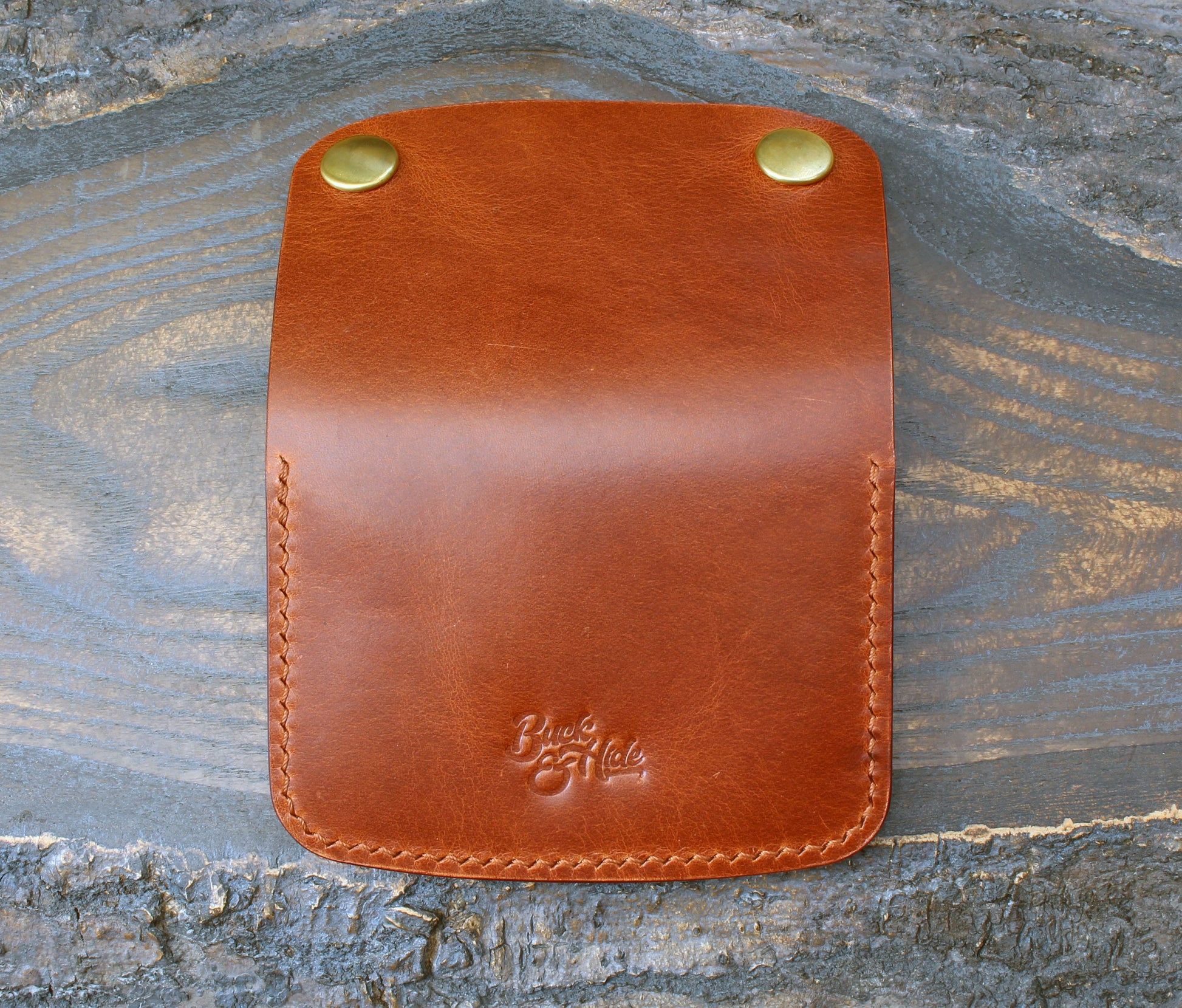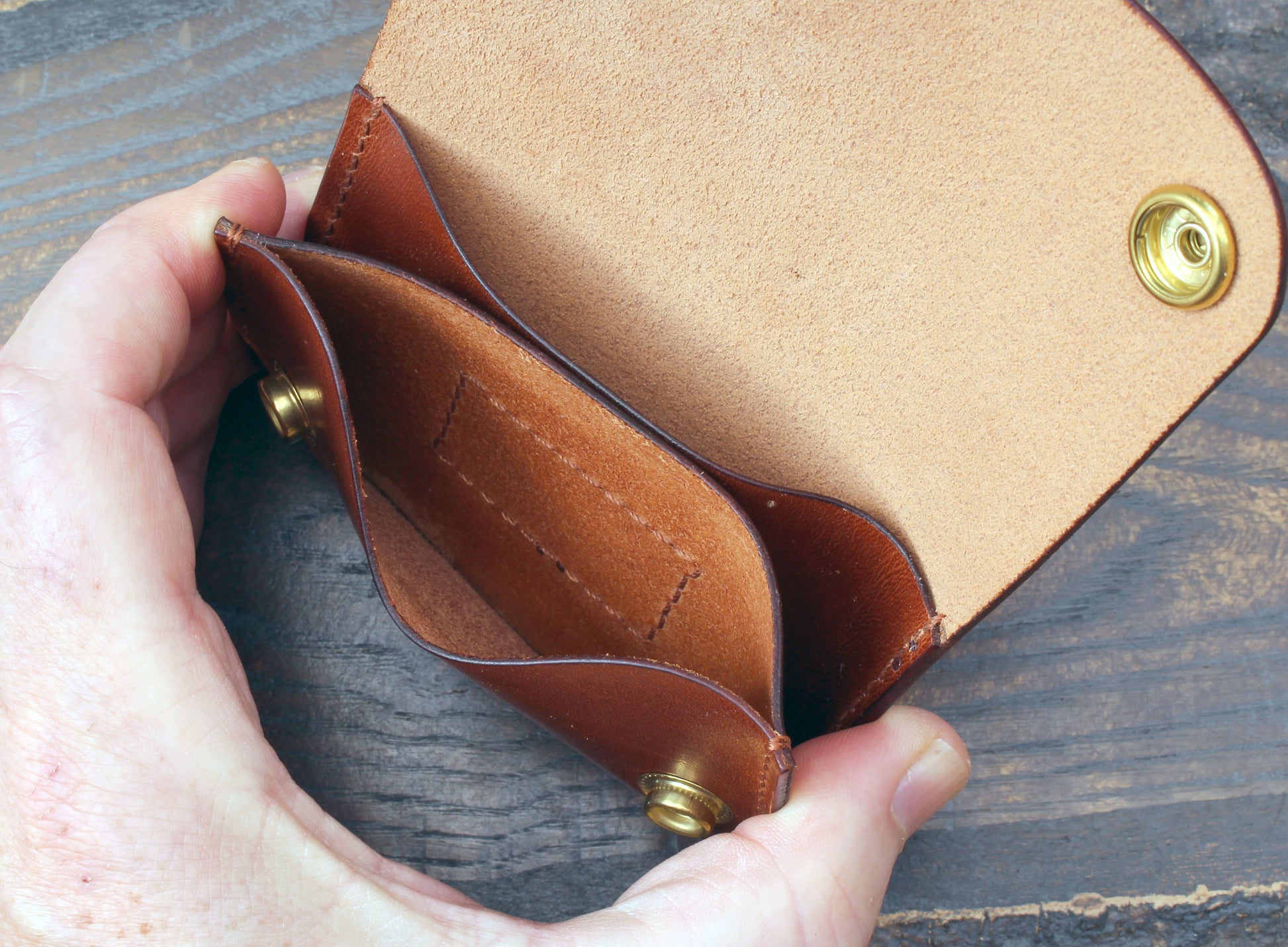 A compact trucker-style snap wallet or purse handmade in Maremma leather in the 'ruggine tan' colour from the Conceria Puccini tannery in Italy. This leather is vegetable-tanned using extracts from a tree renowned for its strength called 'Quebracho'. The leather has a firm feel, a bright glazed finish and a slight pull-up effect.
