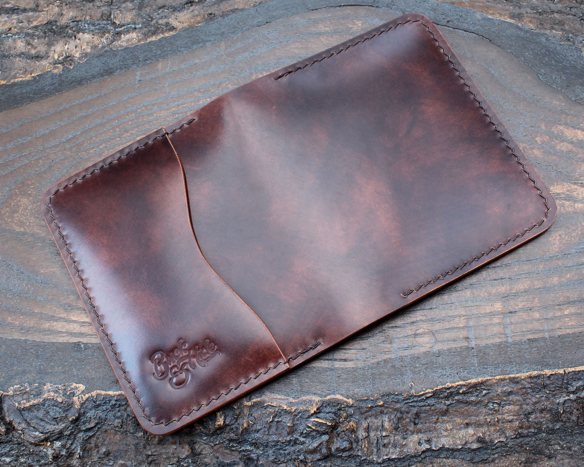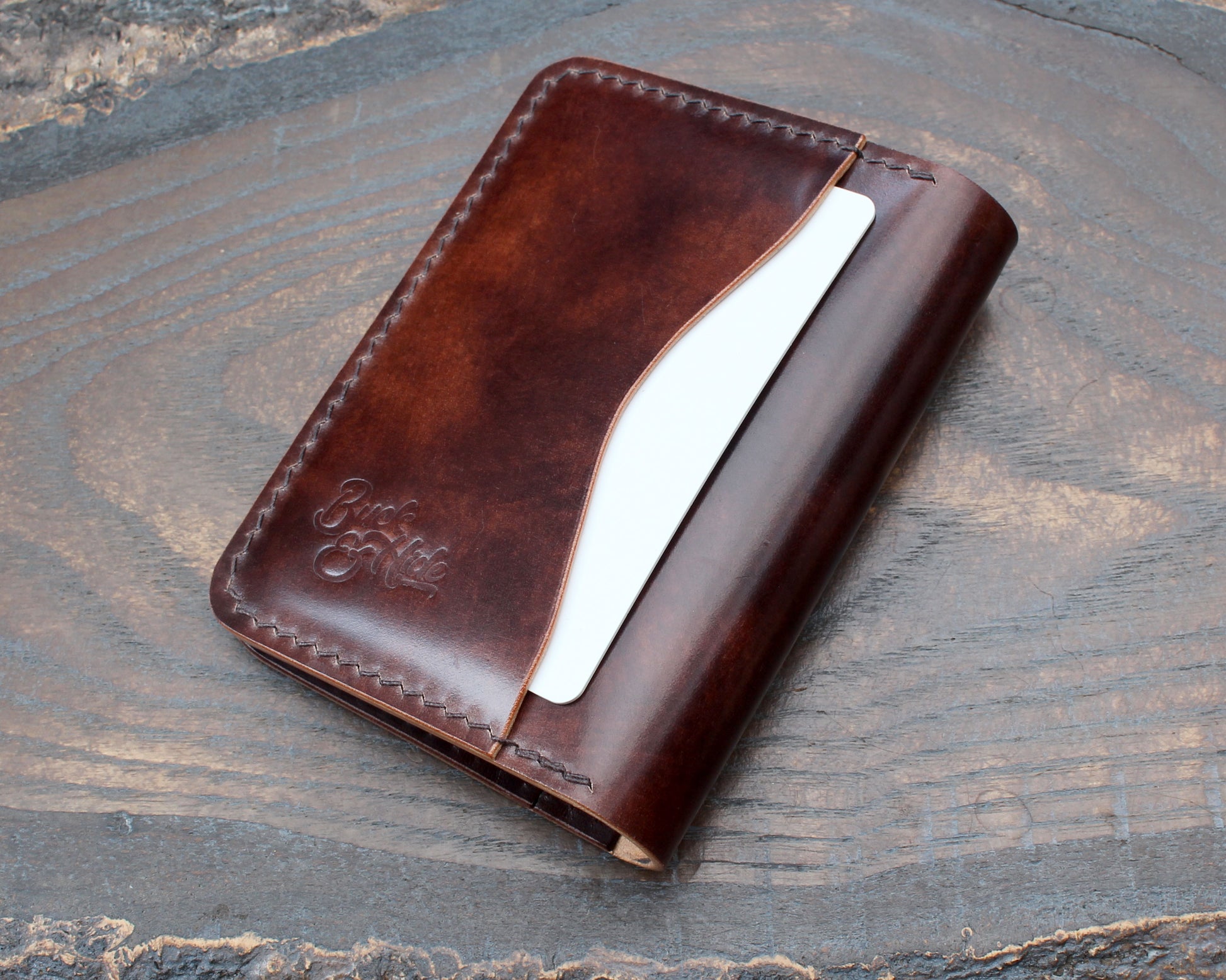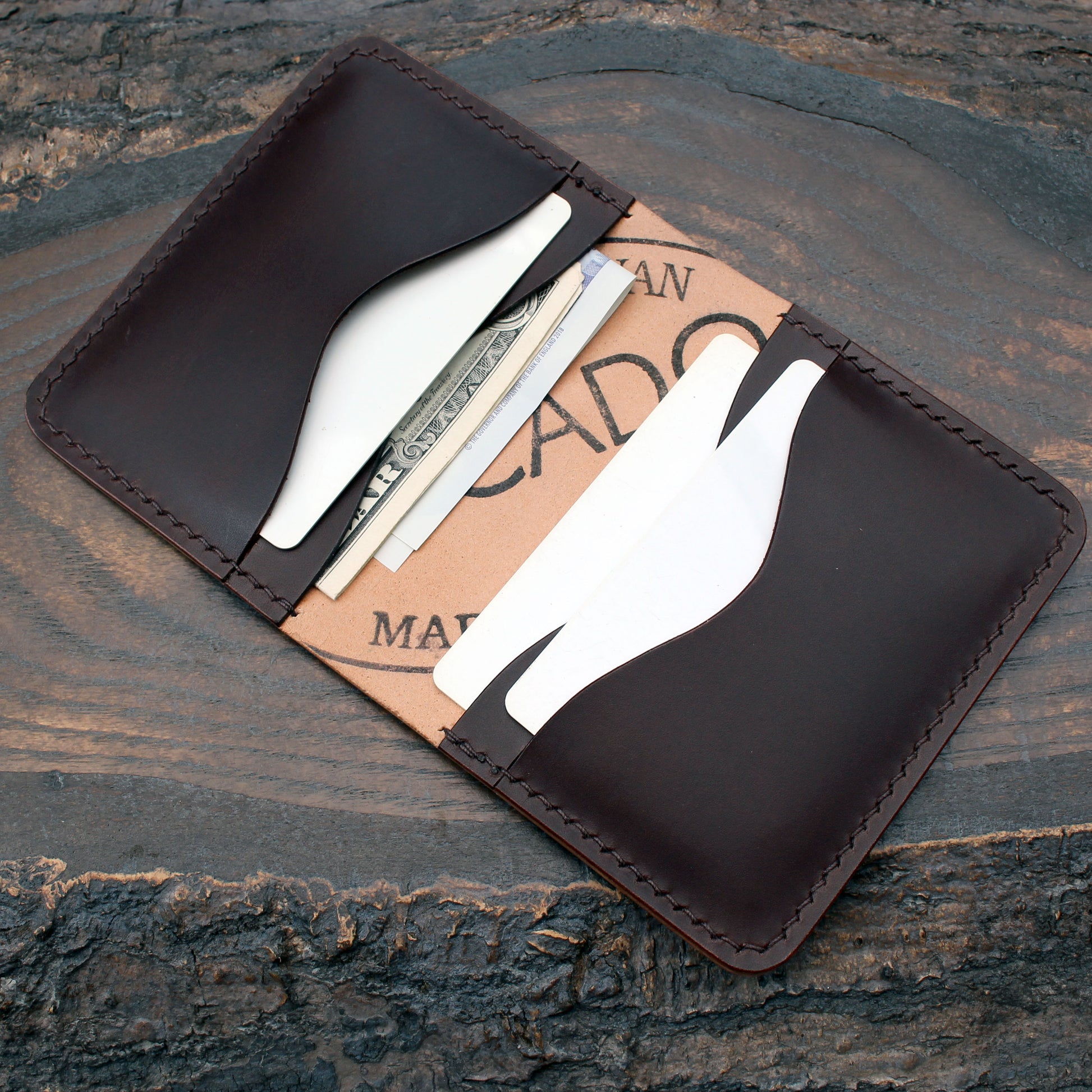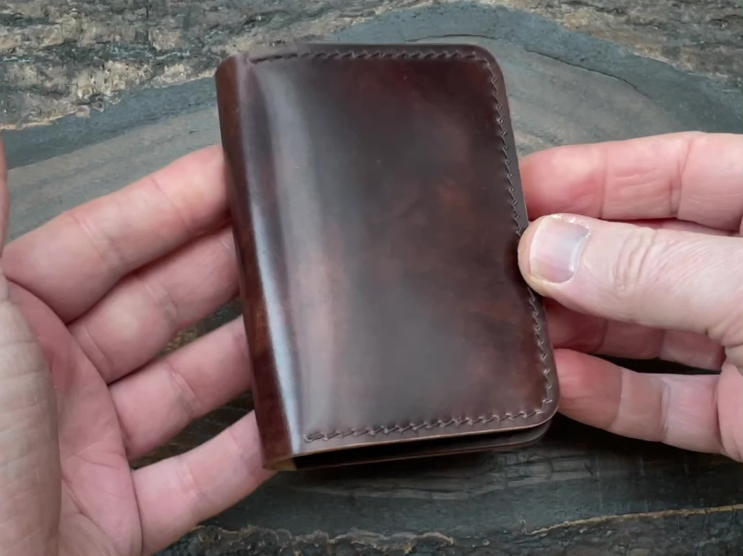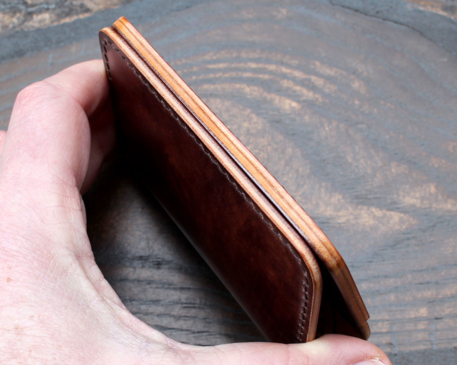 The design gives you 4 slots on the inside for cards or notes - one of the rear slots has internal stitching (hidden by the pocket on the back of the wallet) so it is the correct depth to hold cards. The other (left) rear slot is the full width, so it is good for small banknotes, receipts etc. The slots are pretty snug from new but will free up with use. There's a handy fast-access card pocket on the rear. It's all saddle-stitched together by hand using dark brown Xiange waxed thread.