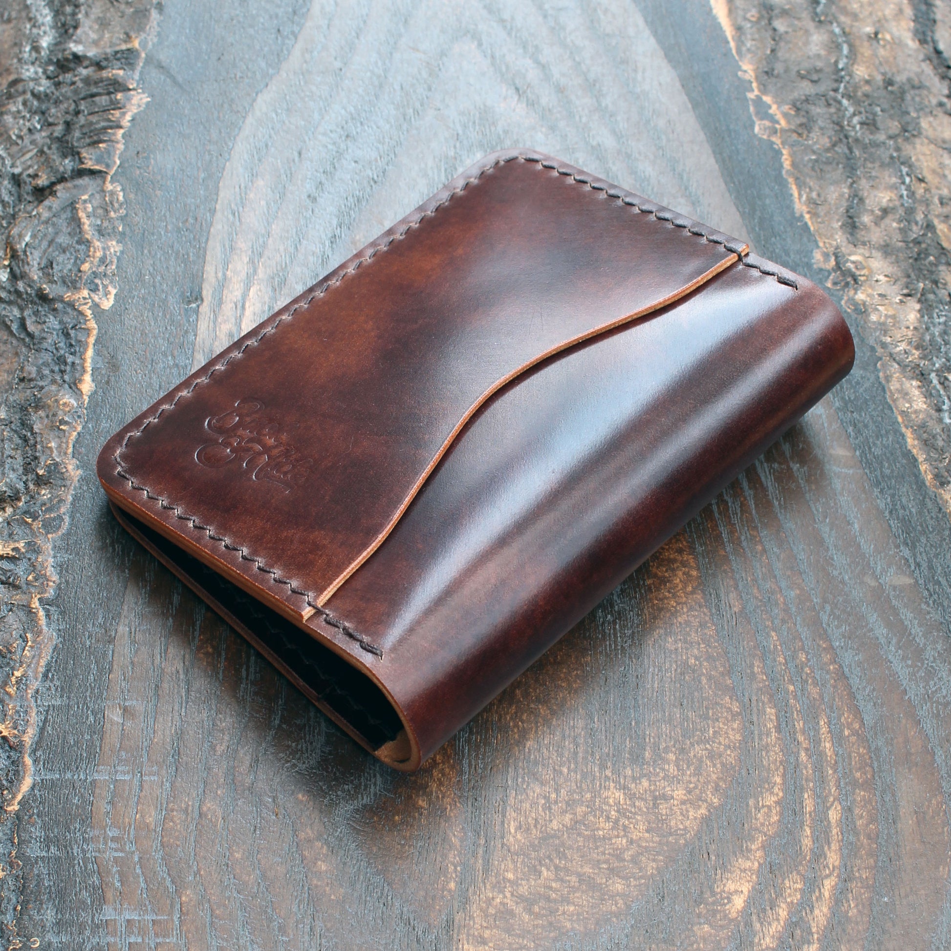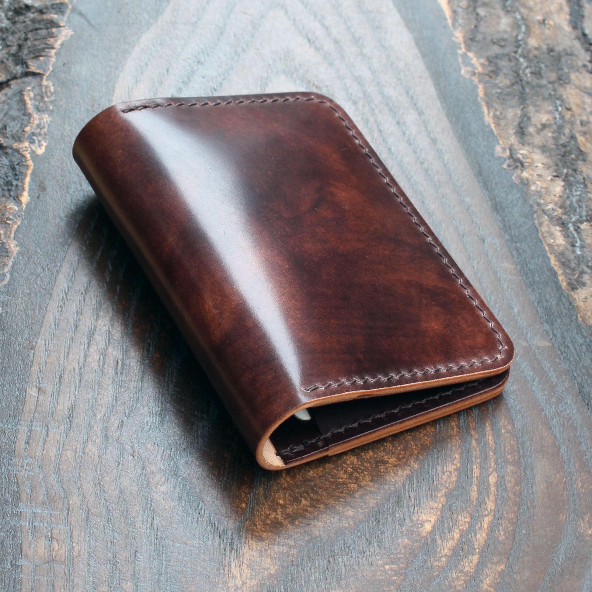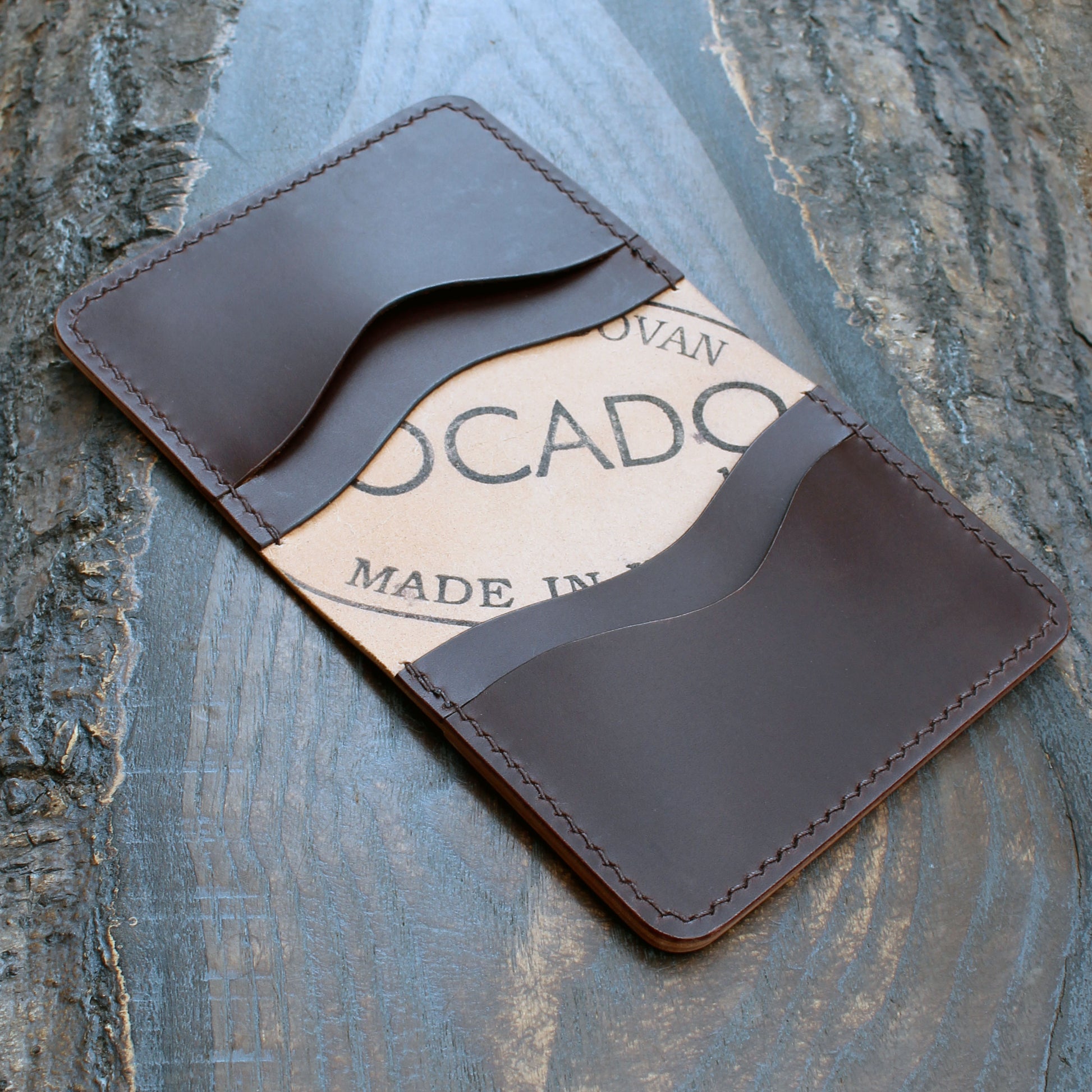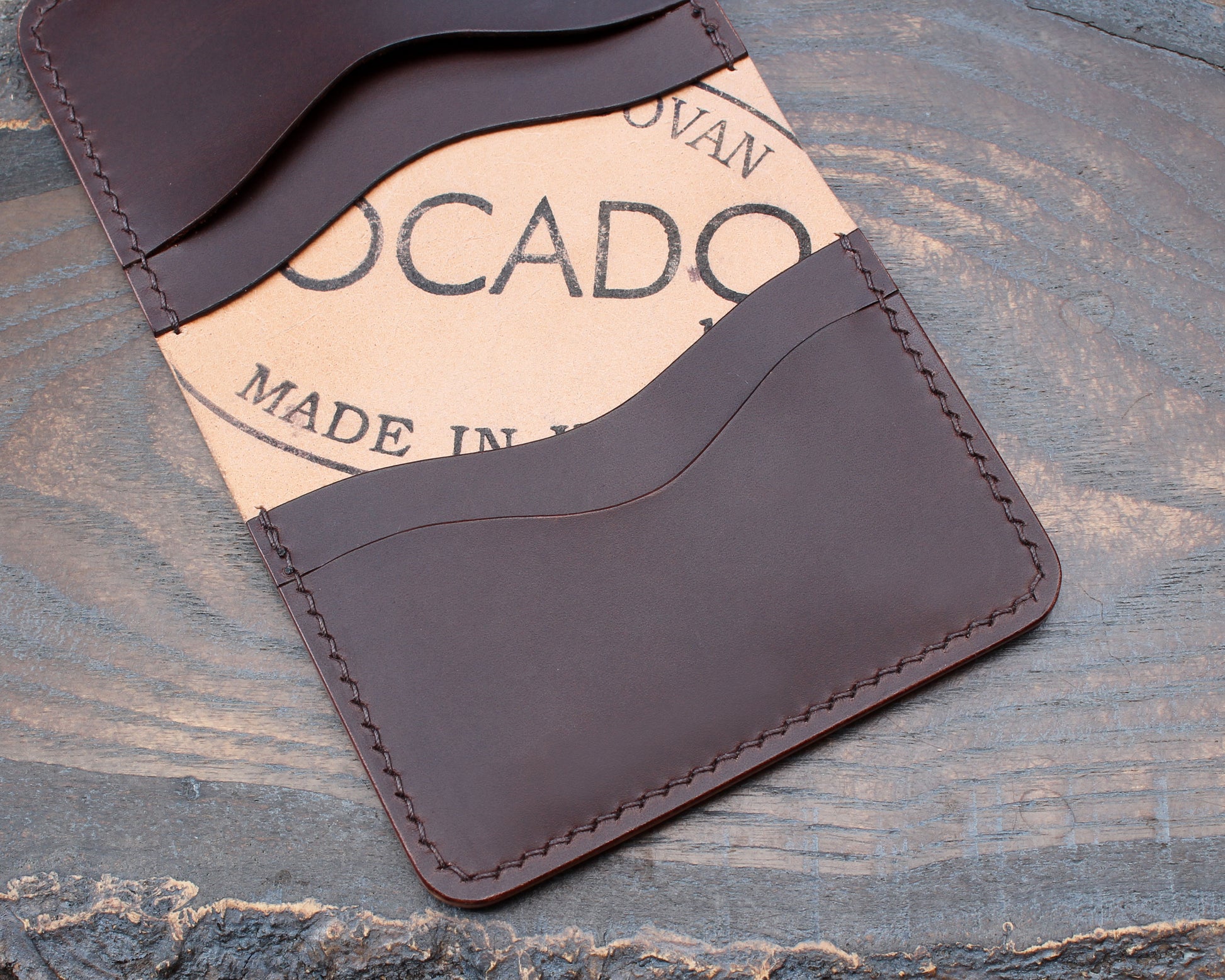 A compact bi-fold card wallet handmade in a combination of quality Italian leathers. The exterior uses marbled brown 'Museum' Shell Cordovan from the Rocado tannery in Italy. Cordovan leather has incredibly dense fibres so is famed for its strength and durability, and has a smooth, glossy finish that is instantly recognisable. It comes from a small part of a horse rear quarters, hence its rarity. On this piece I've used a section of the shell that shows the ROCADO tannery stamp on the inside, always nice to get that! The interior pockets are made in brown Buttero - another quality Italian leather with a smooth, matt finish used by premium manufacturers worldwide.