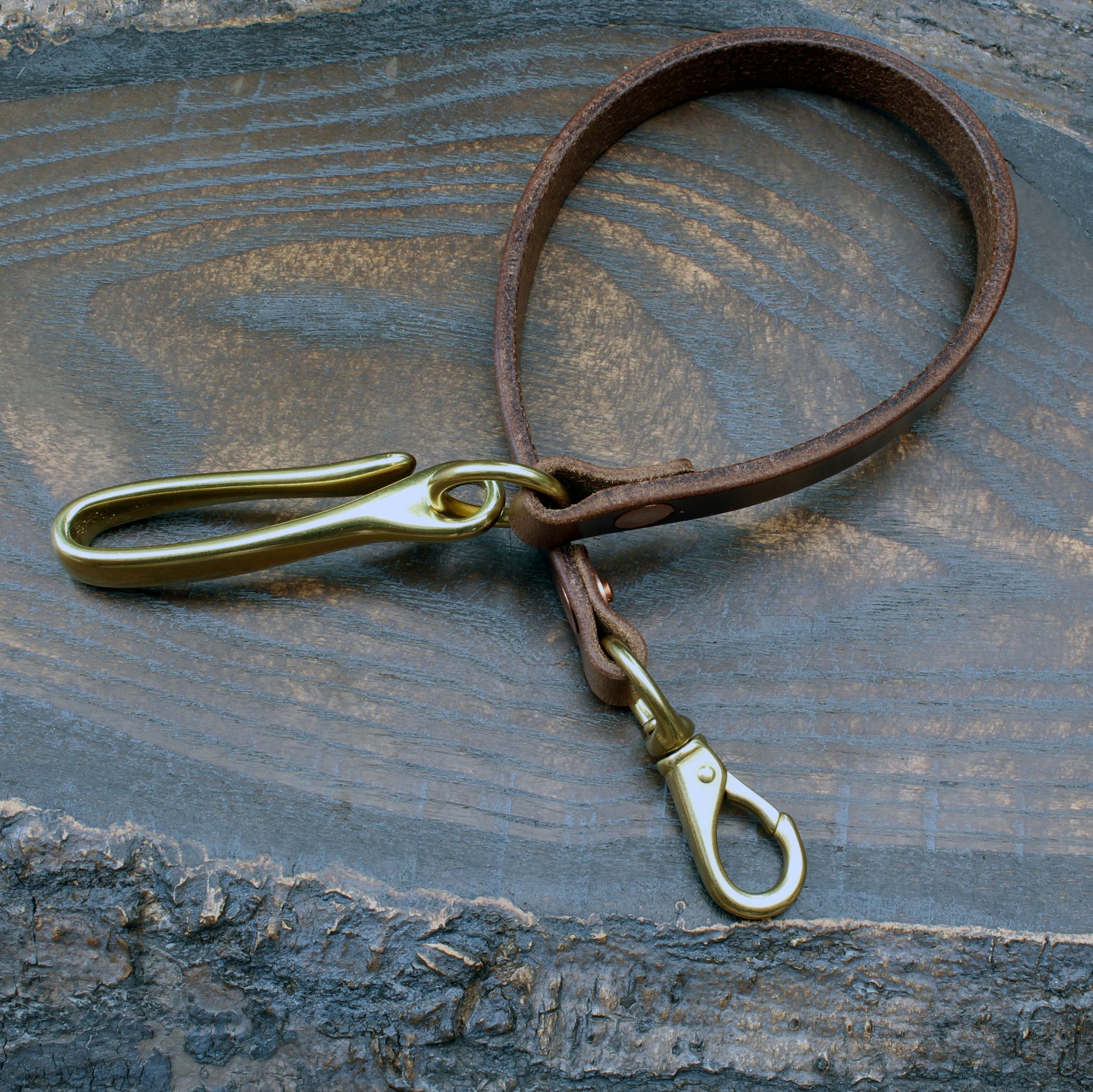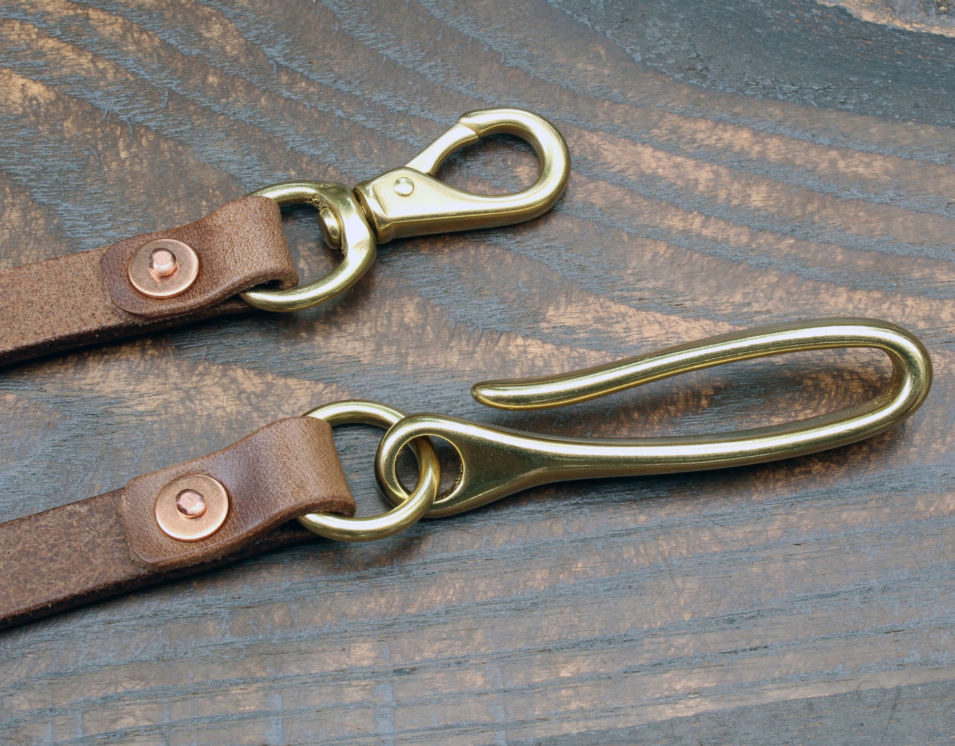 Both pieces of hardware are solid shiny brass and made in a USA foundry. The Japanese-style fish hook slips through a belt loop or over a belt, and this version has a compact swivel trigger clip at the other end so it's quick and easy to attach to your wallet. I've used solid brass saddler rivets to keep everything secure. Edges are hot waxed & buffed.