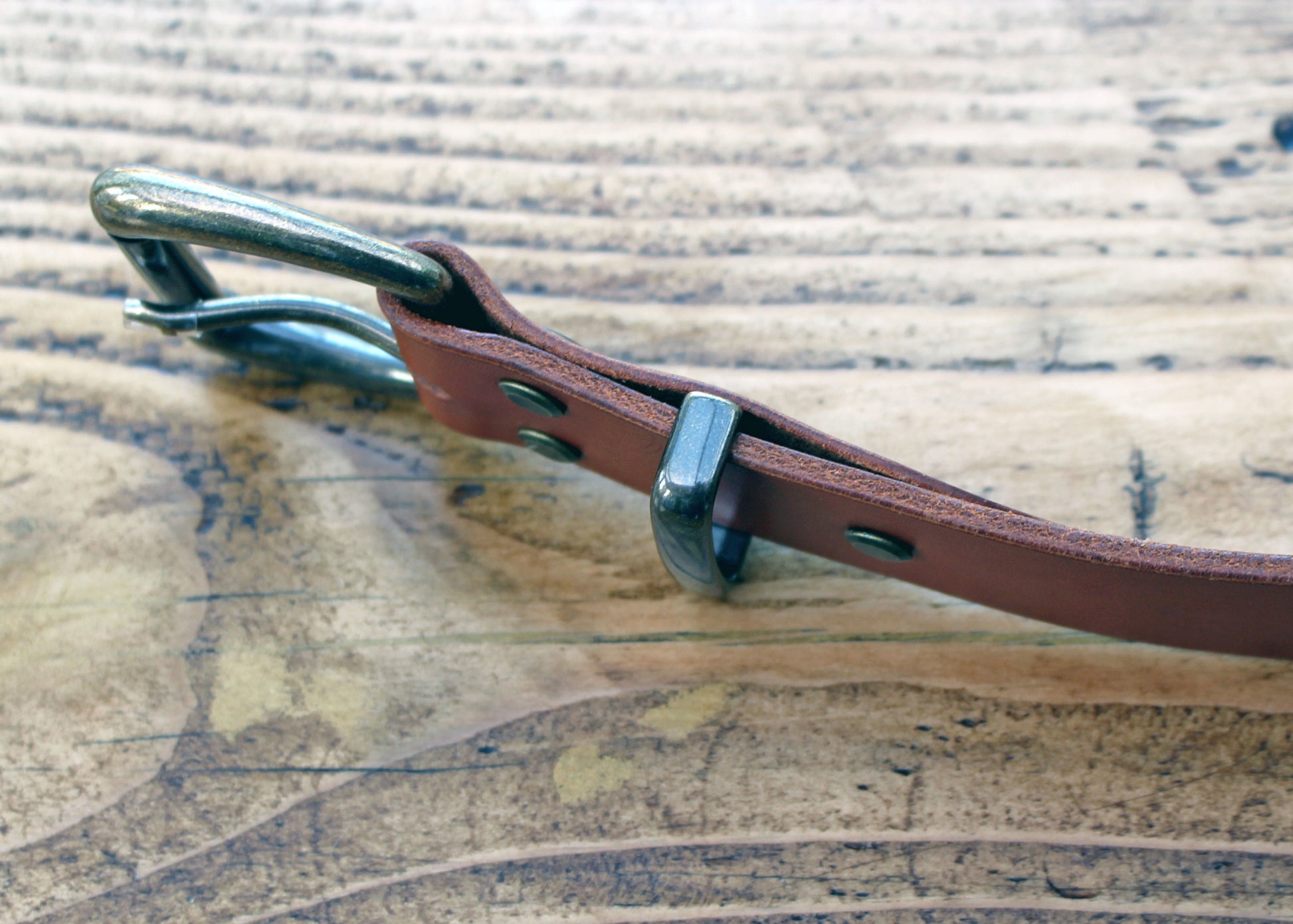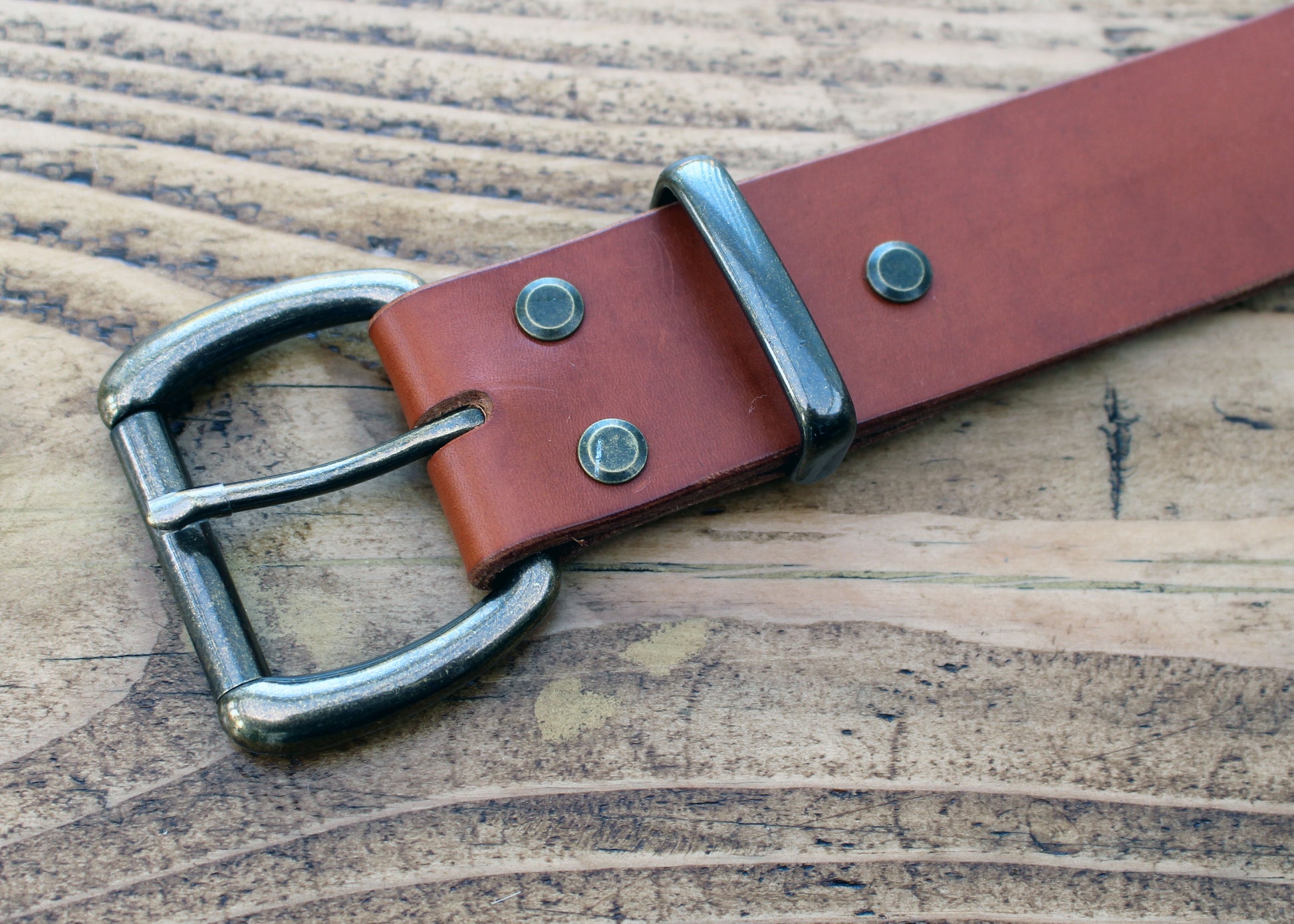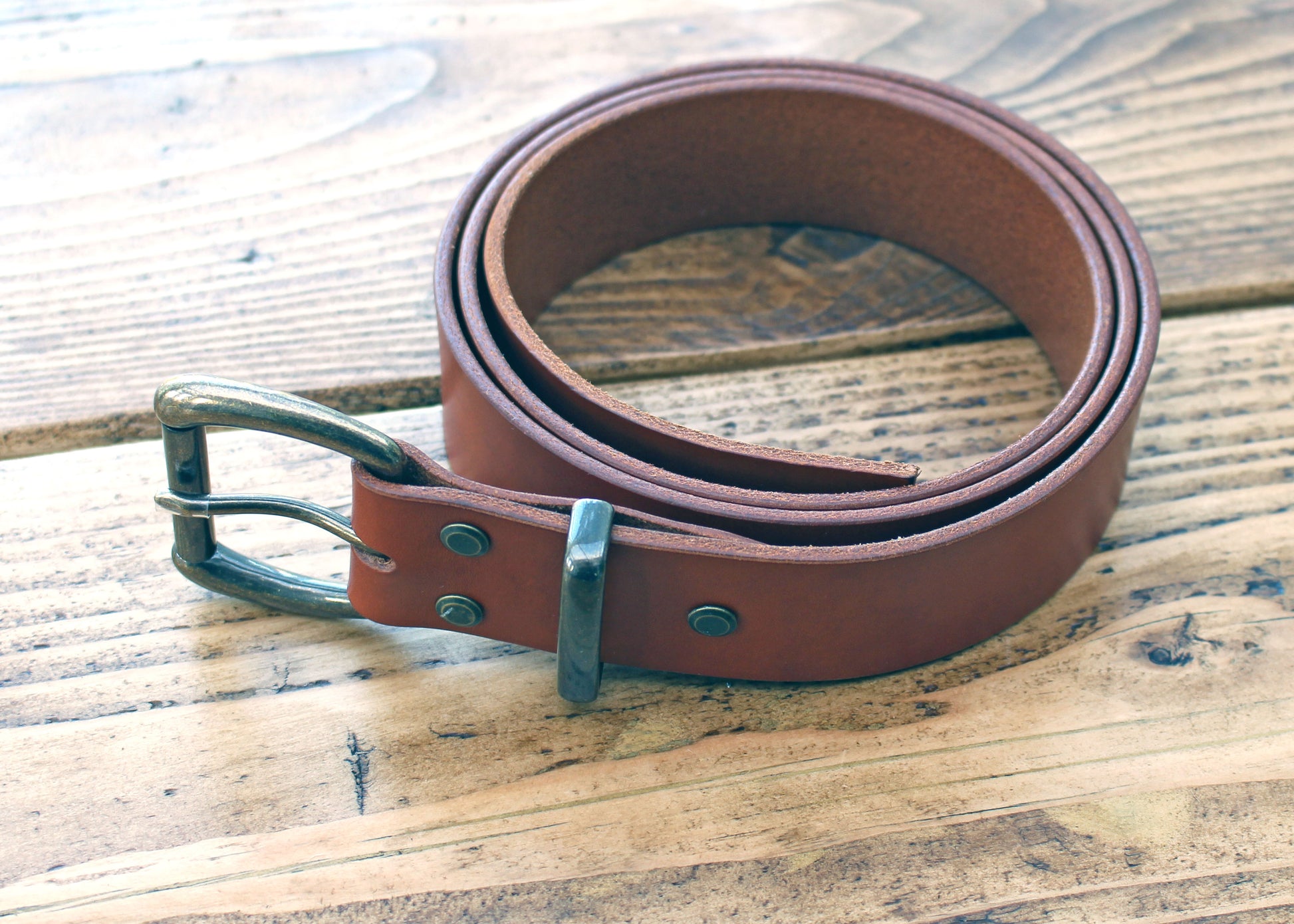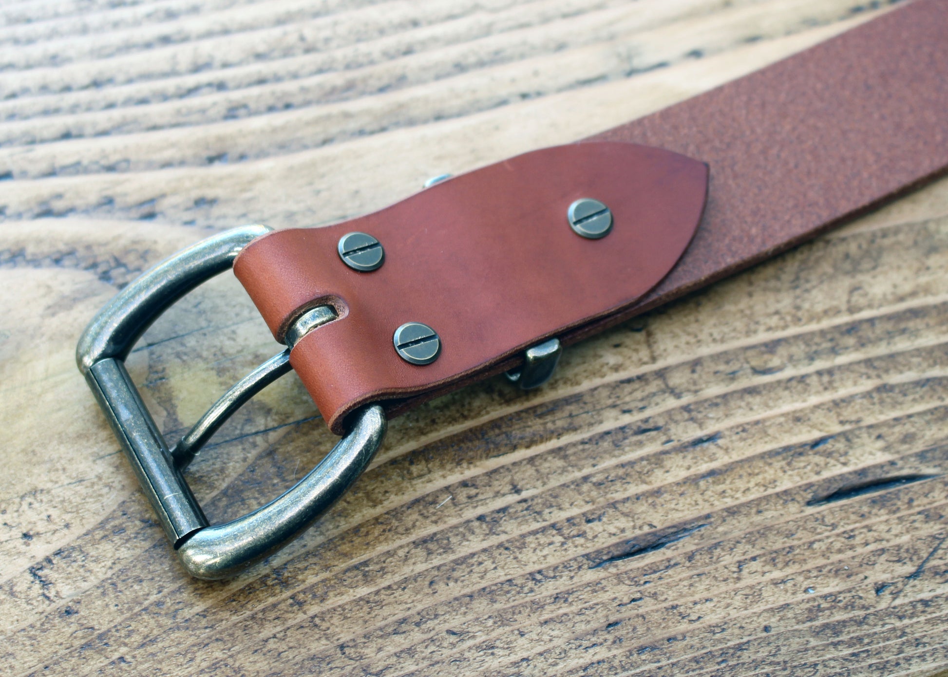 This premium belt is made from vegetable-tanned leather in a rich saddle tan colour. It's firm with a smooth feel and will age beautifully. The strap is 38mm wide (1.5") and approx 3.5mm thick with burnished and waxed edges. The USA-made roller buckle and keeper are solid brass with a nice antique finish. I've used Chicago screws to hold it all together so you have the option to change the buckle (there's a dab of threadlock on these to stop them loosening). I'll take your measurements after you've ordered to make the holes (I usually do 5) and I generally cut an asymmetrical point at the tip of the belt.